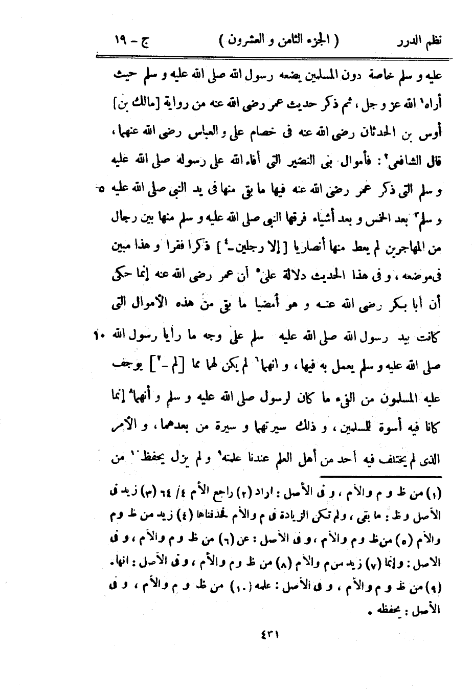 خاصة دون المسلمين يضعه رسوله الله صَلَّى اللهُ عَلَيْهِ وَسَلَّمَ حيث أراه الله عز وجل، ثم ذكر حديث عمر رضي الله عنه من رواية مالك بن أوس بن الحدثان رضي الله عنه في خصام علي والعباس رضي الله عنهما، قال الشافعي: فأموال بني النضير التي أفاء الله على رسوله صَلَّى اللهُ عَلَيْهِ وَسَلَّمَ التي ذكر عمر رضي الله عنه فيها ما بقي منها في يد النبي صَلَّى اللهُ عَلَيْهِ وَسَلَّمَ بعد الخمس وبعد أشياء فرقها النبي صَلَّى اللهُ عَلَيْهِ وَسَلَّمَ منها بين رجال من المهاجرين لم يعط منها أنصارياً إلا رجلين ذكرا فقراً وهذا مبين في موضعه، وفي هذا الحديث دلالة على أن عمر رضي الله عنه إنما حكى أن أبا بكر رضي الله عنه وهو أمضيا ما بقي من هذه الأموال التي كانت بيد رسول الله صَلَّى اللهُ عَلَيْهِ وَسَلَّمَ على وجه ما رأيا رسول الله صَلَّى اللهُ عَلَيْهِ وَسَلَّمَ يعمل به فيها، وأنهما لم يكن لهما مما لم يوجف عليه المسلمون من الفيء ما كان لرسول الله صَلَّى اللهُ عَلَيْهِ وَسَلَّمَ وأنهما إنما كانا فيه أسوة للمسلمين، وذلك سيرتهما وسيرة من بعدهما، والأمر الذي لم يختلف فيه أحد من أهل العلم عندنا علمته ولم يزل يحفظ من