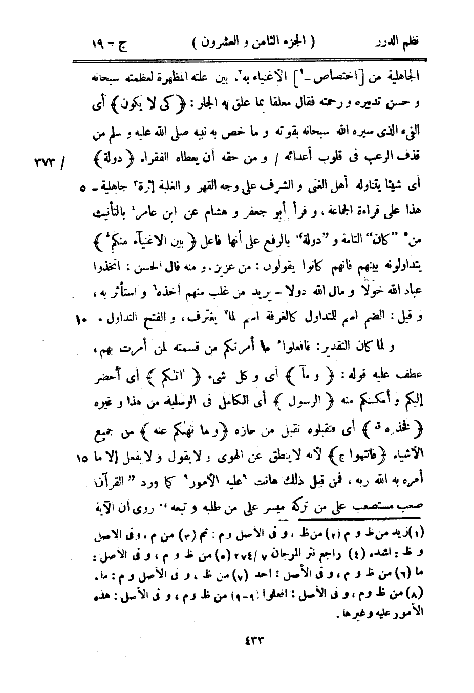 الجاهلية من اختصاص الأغنياء به، بين علته المظهرة لعظمته سبحانه وحسن تدبيره ورحمته فقال معلقاً بما علق به الجار: {كي لا يكون} أي الفيء الذي سيره الله سبحانه بقوته وما خص به نبيه صَلَّى اللهُ عَلَيْهِ وَسَلَّمَ من قذف الرعب في قلوب أعدائه ومن حقه أن يعطاه الفقراء {دولة} أي شيئاً يتناوله أهل الغنى والشرف على وجه القهر والغلبة إثرة جاهلية - هذا على قراءة الجماعة، وقرأ أبو جعفر وهشام عن ابن عامر بالتأنيث من {كان} التامة و {دولة} بالرفع على أنها فاعل {بين الأغنياء منكم} يتداولونه بينهم فإنهم كانوا يقولون: من عزيز، ومنه قال الحسن: اتخذوا عباد الله خولاً ومال الله دولاً - يريد من غلب منهم أخذه واستأثر به، وقيل: الضم اسم للمتداول كالغرفة اسم لما يغترف، والفتح التداول.