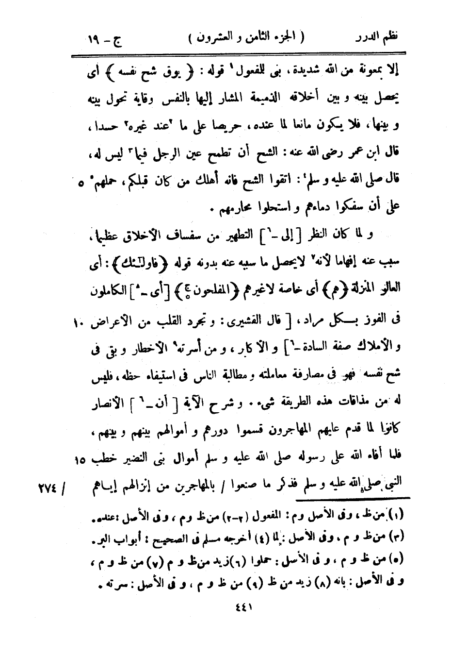 إلا بمعونة من الله شديدة، بنى للمفعول قوله: {يوق شح نفسه} أي يحصل بينه وبين أخلاقه الذميمة المشار إليها بالنفس، وقاية تحول بينه وبينها، فلا يكون مانعاً لما عنده، حريصاً على ما عند غيره حسداً، قال ابن عمر رضي الله عنه: الشح أن تطمح عين الرجل فيما ليس له، قال صَلَّى اللهُ عَلَيْهِ وَسَلَّمَ: «اتقوا الشح فإنه أهلك من كان قبلكم، حملهم على أن سفكوا دماءهم واستحلوا محارمهم» .