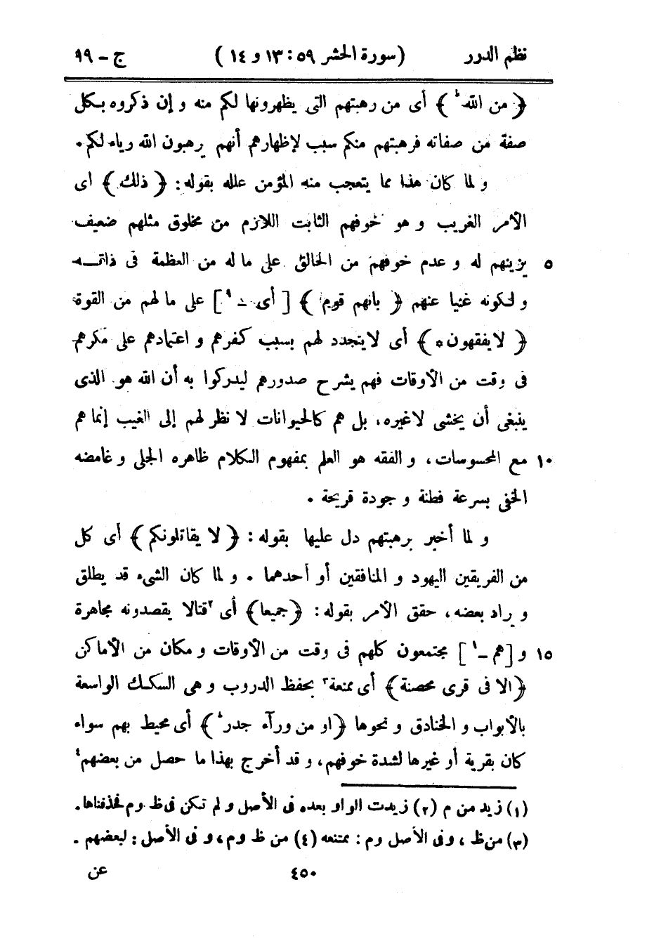 ولما أخبر برهبتهم دل عليها بقوله: {لا يقاتلونكم} أي كل من الفريقين اليهود والمنافقين أو أحدهما. ولما كان الشيء قد يطلق ويراد بعضه، حقق الأمر بقوله: {جميعاً} أي قتالاً يقصدونه مجاهرة وهم مجتمعون كلهم في وقت من الأوقات ومكان من الأماكن {إلا في قرى محصنة} أي ممنعة بحفظ الدروب وهي السكك الواسعة بالأبواب والخنادق ونحوها {أو من وراء جدر} أي محيط بهم سواء كان بقرية أو غيرها لشدة خوفهم، وقد أخرج بهذا ما حصل من بعضهم