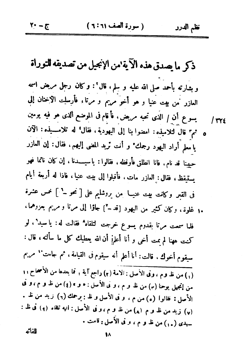 وبشارته بأحمد صَلَّى اللهُ عَلَيْهِ وَسَلَّمَ، قال: وكان رجل مريض اسمه العازر من بيت عنيا وهو أخو مريم ومرتا، فأرسلت الأختان إلى يسوع أن الذي تحبه مريض، فأقام في الموضع الذي هو فيه يومين ثم قال لتلاميذه: امضوا بنا إلى اليهودية، فقال له تلاميذه: الآن يا معلم أراد اليهود رجمك وأنت تريد المضي إليهم، فقال: إن العازر حبيبنا قد نام، فأنا انطلق فاوقظه، فقال: يا سيدنا، إن كان نائماً فهو يستيقظ، فقال العازر مات، فأقبلوا إلى بيت عنيا، فإذا له أربعة أيام في القبر وكانت بيت عنيا من يروشليم على نحو خمس عشرة غلوة، وكان كثير من اليهود قد جاؤوا إلى مرتا ومريم يعزوهما، فلما سمعت مرتا بقدوم يسوع خرجت لتلقاه فقالت له: يا سيد، لو كنت ههنا لم يمت أخي وأنا أعلم أن الله يعطيك كل ما سألته، قال: سيقوم أخوك، قالت: أنا أعلم أنه سيقوم في القيامة، ثم جاءت مريم