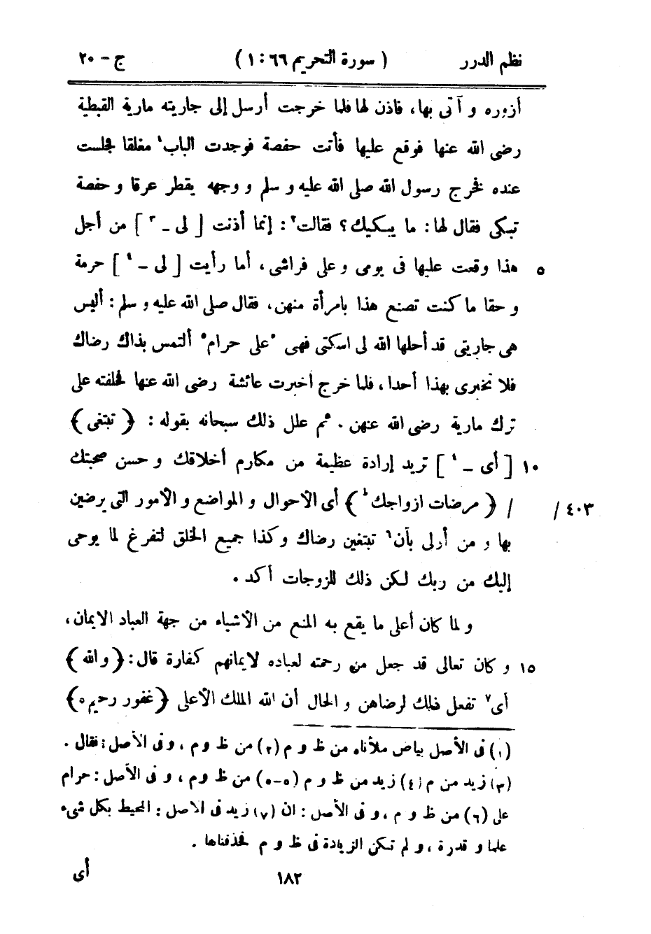 أزوره وآتي بها، فأذن لها فلما خرجت أرسل إلى جاريته مارية القبطية رضي الله عنها فوقع عليها فأتت حفصة فوجدت الباب مغلقاً فجلست عنده فخرج رسول الله صَلَّى اللهُ عَلَيْهِ وَسَلَّمَ ووجهه يقطر عرقاً وحفصة تبكي فقال لها: ما يبكيك؟ فقالت: إنما أذنت لي من أجل هذا وقعت عليها في يومي وعلى فراشي، أما رأيت لي حرمة وحقاً ما كنت تصنع هذا بامرأة منهن، فقال صَلَّى اللهُ عَلَيْهِ وَسَلَّمَ: أليس هي جاريتي قد أحلها الله لي اسكتي فهي علي حرام ألتمس بذاك رضاك فلا تخبري بهذا أحداً، فلما خرج أخبرت عائشة رضي الله عنها فحلفته على ترك مارية رضي الله عنهن» ثم علل ذلك سبحانه بقوله: {تبتغي} أي تريد إرادة عظيمة من مكارم أخلاقك وحسن صحبتك {مرضات أزواجك} أي الأحوال والمواضع والأمور التي يرضين بها ومن أولى بأن تبتغين رضاك وكذا جميع الخلق لتفرغ لما يوحى إليك من ربك لكن ذلك للزوجات آكد.