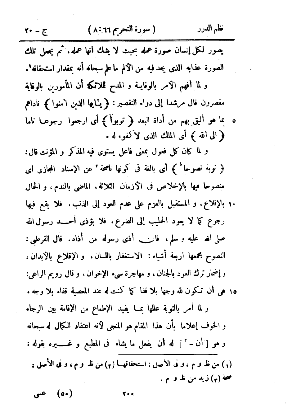 ولما كان كل فعول بمعنى فاعل يستوي فيه المذكر والمؤنث قال: {توبة نصوحاً} أي بالغة في كونها ناصحة عن الإسناد المجازي أي منصوحاً فيها بالإخلاص في الأزمان الثلاثة، الماضي بالندم، والحال بالإقلاع. والمستقبل بالعزم على عدم العود إلى الذنب، فلا يقع فيها رجوع كما لا يعود الحليب إلى الضرع، فلا يؤذي أحد رسول الله صَلَّى اللهُ عَلَيْهِ وَسَلَّمَ، فإن أذى رسوله من أذاه، قال القرطبي: النصوح مجمعها أربعة أشياء: الاستغفار باللسان، والإقلاع بالأبدان، وإضمار ترك العود بالجنان، ومهاجرة سيىء الإخوان، وقال رويم الراعي: هي أن تكون لله وجهاً بلا قفا كما كانت له عند المعصية قفاء بلا وجه.