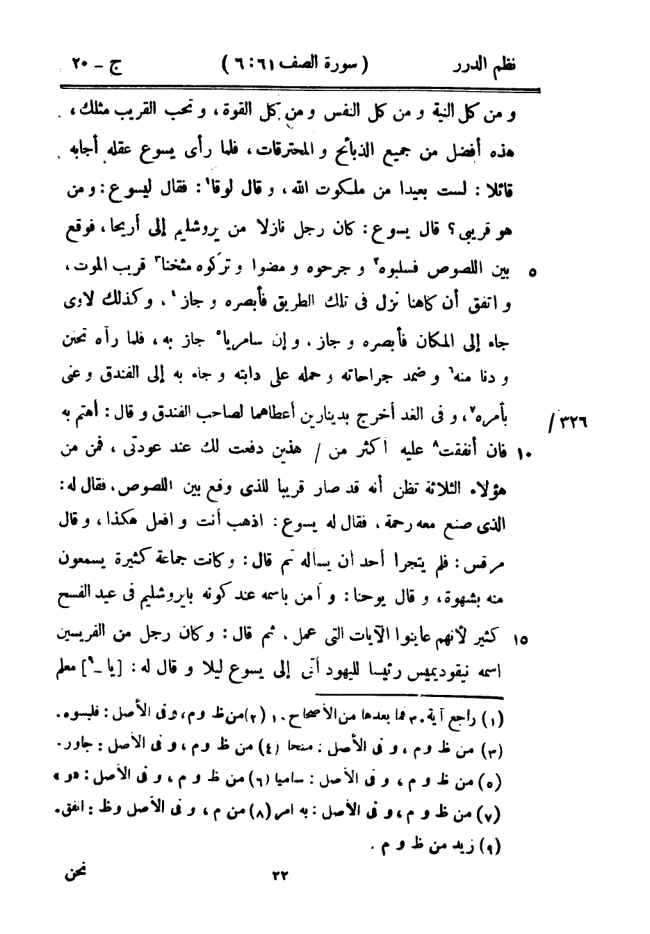 ومن كل النية ومن كل النفس ومن كل القوة، وتحب القريب مثلك، هذه أفضل من جميع الذبائح والمحترقات، فلما رأى يسوع عقله أجابه قائلاً: لست بعيدا من ملكوت الله، وقال لوقا: فقال ليسوع: ومن هو قريبي؟ قال يسوع: كان رجل نازلاً من يروشليم إلى أريحا، فوقع بين اللصوص فسلبوه وجرحوه ومضوا وتركوه مثخناً قريب الموت، واتفق أن كاهناً نزل في تلك الطريق فأبصره وجاز، وكذلك لاوي جاء إلى المكان فأبصره وجاز، وإن سامرياً جاز به، فلما رآه تحنن ودنا منه وضمد جراحاته وحمله على دابته وجاء به إلى الفندق وعني بأمره، وفي الغد أخرج بدينارين أعطاهما لصاحب الفندق وقال: اهتم به فإن أنفقت عليه أكثر من هذين دفعت لك عند عودتي، فمن من هؤلاء الثلاثة تظن أنه قد صار قريباً للذي وقع بين اللصوص، فقال له: الذي صنع معه رحمة، فقال له يسوع: اذهب أنت وافعل هكذا، وقال مرقس: فلم يتجرأ أحد أن يسأله ثم قال: وكانت جماعة كثيرة يسمعون منه بشهوة، وقال يوحنا: وآمن باسمه عند كونه بإيروشليم في عيد الفسح كثير لأنهم عاينوا الآيات التي عمل، ثم قال: وكان رجل من الفريسيين اسمه نيقوديميس رئيساً لليهود أتى إلى يسوع ليلاً وقال له: يا معلم