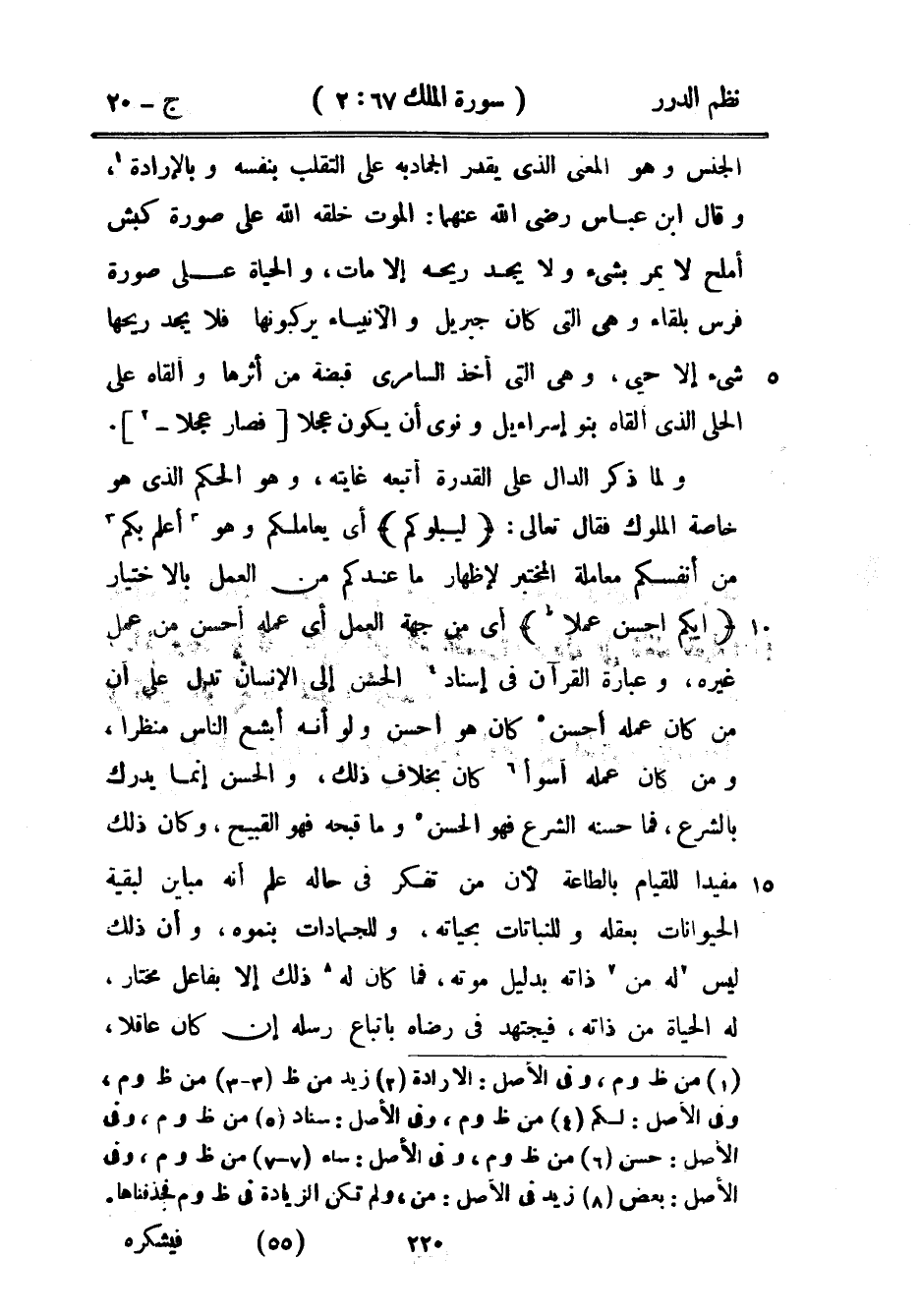 ولما ذكر الدال على القدرة أتبعه غايته، وهو الحكم الذي هو خاصة الملوك فقال تعالى: {ليبلوكم} أي يعاملكم وهو أعلم بكم من أنفسكم معاملة المختبر لإظهار ما عندكم من العمل بالاختيار {أيكم أحسن عملاً} أي من جهة العمل أي عمله أحسن من عمل غيره، وعبارة القرآن في إسناد الحسن إلى الإنسان تدل على أن من كان عمله أحسن كان هو أحسن ولو أنه أبشع الناس منظراً، ومن كان عمله أسوأ كان بخلاف ذلك، والحسن إنما يدرك بالشرع، فما حسنه الشرع فهو الحسن وما قبحه فهو القبيح، وكان ذلك مفيداً للقيام بالطاعة لأن من تفكر في حاله علم أنه مباين لبقية الحيوانات بعقلة وللنباتات بحياته، وللجمادات بنموه، وأن ذلك ليس له من ذاته بدليل موته، فما كان له ذلك إلا بفاعل مختار، له الحياة من ذاته، فيجتهد في رضاه باتباع رسله إن كان عاقلاً،