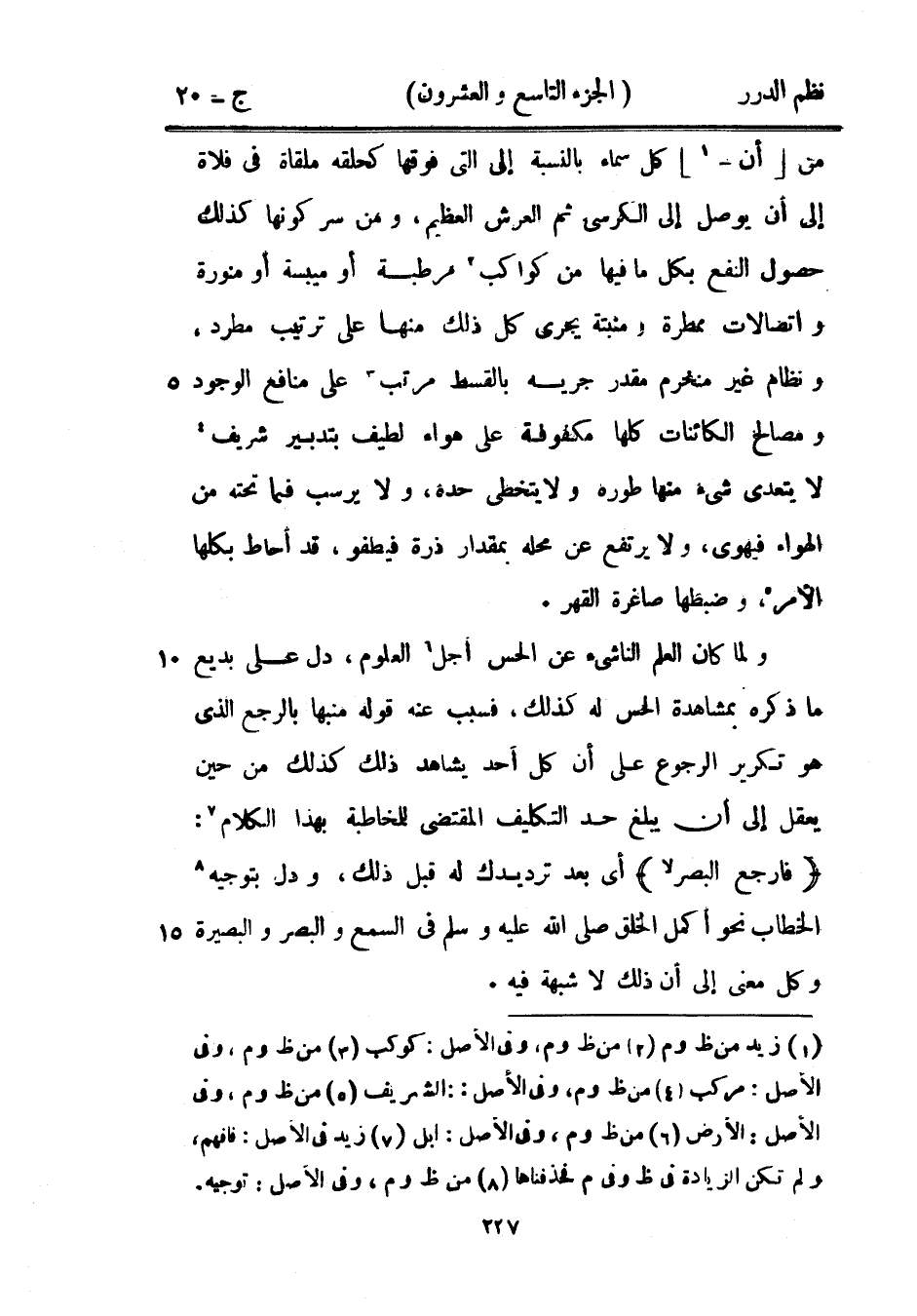 من أن كل سماء بالنسبة إلى التي فوقها كحلقة ملقاة في فلاة إلى أن يوصل إلى الكرسي ثم العرش العظيم، ومن سر كونها كذلك حصول النفع بكل ما فيها من كواكب مرطبة أو ميبسة أو منورة واتصالات ممطرة ومثبتة يجري كل ذلك منها على ترتيب مطرد، ونظام غير منخرم مقدر جريه بالقسط مرتب على منافع الوجود ومصالح الكائنات كلها مكفوفة على هواء لطيف بتدبير شريف: لا يتعدى شيء منها طوره ولا يتخطى حده، ولا يرسب فيها تحته من الهواء فيهوي، ولا يرتفع عن محله بمقدار ذرة فيطفو، قد أحاط بكلها الأمر، وضبطها صاغرة القهر.