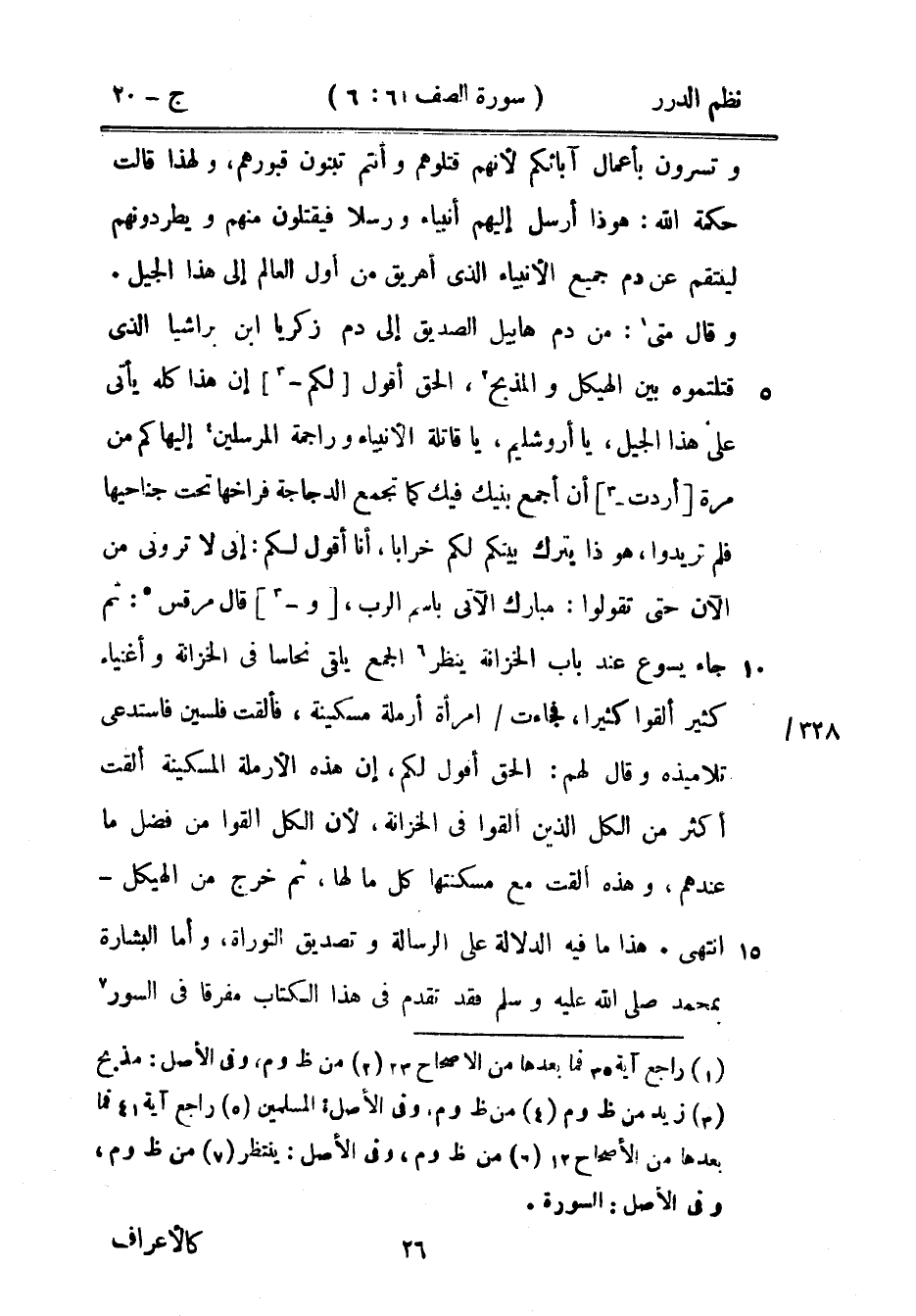 وتسرون بأعمال آبائكم لأنهم قتلوهم وأنتم تبنون قبورهم، ولهذا قالت حكمة الله: هوذا أرسل إليهم أنبياء ورسلاً فيقتلون منهم ويطردونهم لينتقم عن دم جميع الأنبياء الذي أهريق من أول العالم إلى هذا الجيل. وقال متى: من دم هابيل الصديق إلى دم زكريا بن براشيا الذي قتلتموه بين الهيكل والمذبح، الحق أقول لكم إن هذا كله يأتي على هذا الجيل، يا أروشليم، يا قاتلة الأنبياء وراجمة المرسلين إليها كم من مرة أردت أن أجمع بنيك فيك كما تجمع الدجاجة فراخها تحت جناحيها فلم تريدوا، هوذا يترك بينكم لكم خراباً، أنا أقول لكم: إني لا تروني من الآن حتى تقولوا: مبارك الآتي باسم الرب، وقال مرقس: ثم جاء يسوع عند باب الخزانة ينظر الجمع يلقي نحاساً في الخزانة وأغنياء كثير ألقوا كثيراً، فجاءت امرأة أرملة مسكينة، فألقت فلسين فاستدعى تلاميذه وقال لهم: الحق أقول لكم، إن هذه الأرملة المسكينة ألقت أكثر من الكل الذين ألقوا في الخزانة، لأن الكل القوا من فضل ما عنده، وهذه ألقت مع مسكنتها كل ما لها، ثم خرج من الهيكل - انتهى. هذا ما فيه الدلالة على الرسالة وتصديق التوراة، وأما البشارة بمحمد صَلَّى اللهُ عَلَيْهِ وَسَلَّمَ فقد تقدم في هذا الكتاب مفرقاً في السور