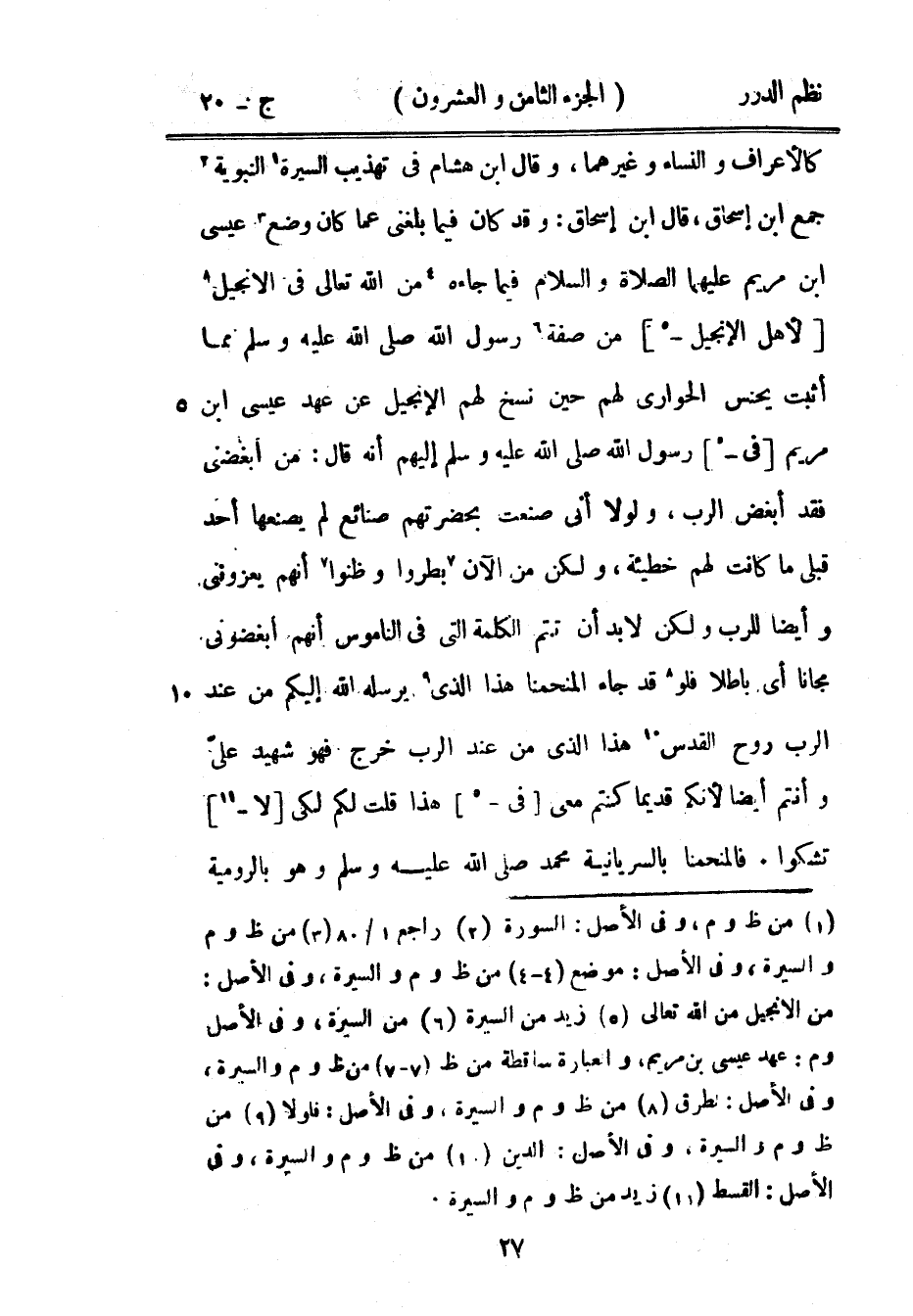 كالأعراف والنساء وغيرهما، وقال ابن هشام في تهذيب السيرة النبوية جمع ابن إسحاق، قال ابن إسحاق: وقد كان فيما بلغني عما كان وضع عيسى ابن مريم عليهما الصلاة والسلام فيما جاءه من الله تعالى في الانجيل لأهل الإنجيل من صفة رسول الله صَلَّى اللهُ عَلَيْهِ وَسَلَّمَ مما أثبت يحنس الحواري لهم حين نسخ لهم الإنجيل عن عهد عيسى ابن مريم في رسول الله صَلَّى اللهُ عَلَيْهِ وَسَلَّمَ إليهم أنه قال: من أبغضني فقد أبغض الرب، ولولا أني صنعت بحضرتهم صنائع لم يصنعها أحد قبلي ما كانت لهم خطيئة، ولكن من الآن بطروا وظنوا أنهم يعزونني وأيضاً للرب ولكن لا بد أن تتم الكلمة التي في الناموس أنهم أبغضوني مجاناً أي باطلاً فلو قد جاء المنحمنا هذا الذي يرسله الله إليكم من عند الرب روح القدس هذا الذي من عند الرب خرج فهو شهيد عليّ وأنتم أيضاً لأنكم قديماً كنتم معي في هذا قلت لكم لكي لا تشكوا.