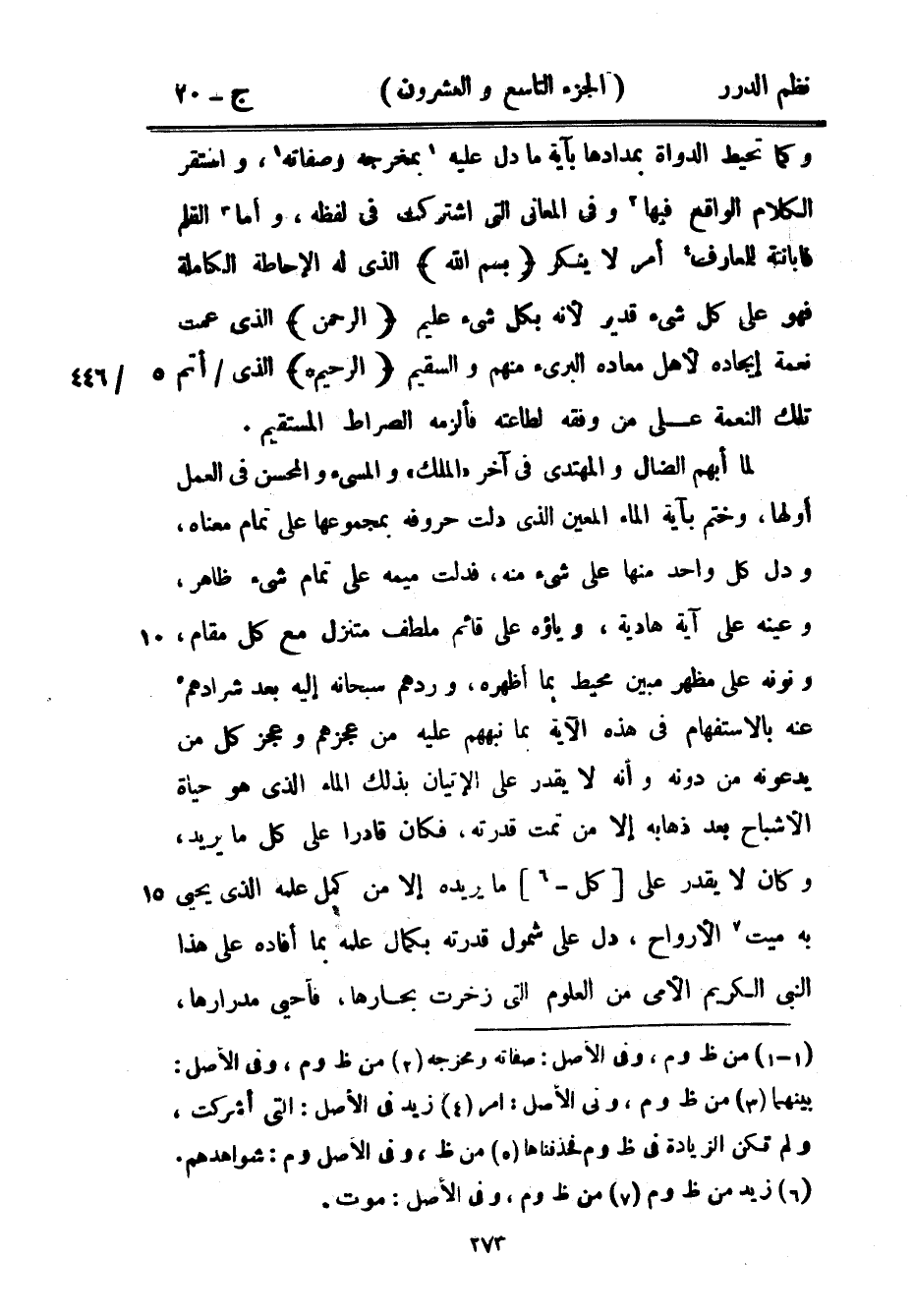وكما تحيط الدواة بمدادها بآية ما دل عليه بمخرجه وصفاته، واستقر الكلام الواقع فيها وفي المعهاني التي اشتركت في لفظه، وأمات القلم فإبانته للمعارف أمر لا ينكر) بسم الله (الذي له الإحاطة الكاملة فهو على كل شيء قدير لأنه بكل شيء عليم) الرحمن (الذي عمت نعمة إيجاده لأهل معاده البرئ منهم والسقيم) الرحيم (الذي أتم تلك النعمة على من وفقه لطاعته فألزمه الصراط المستقيم.
