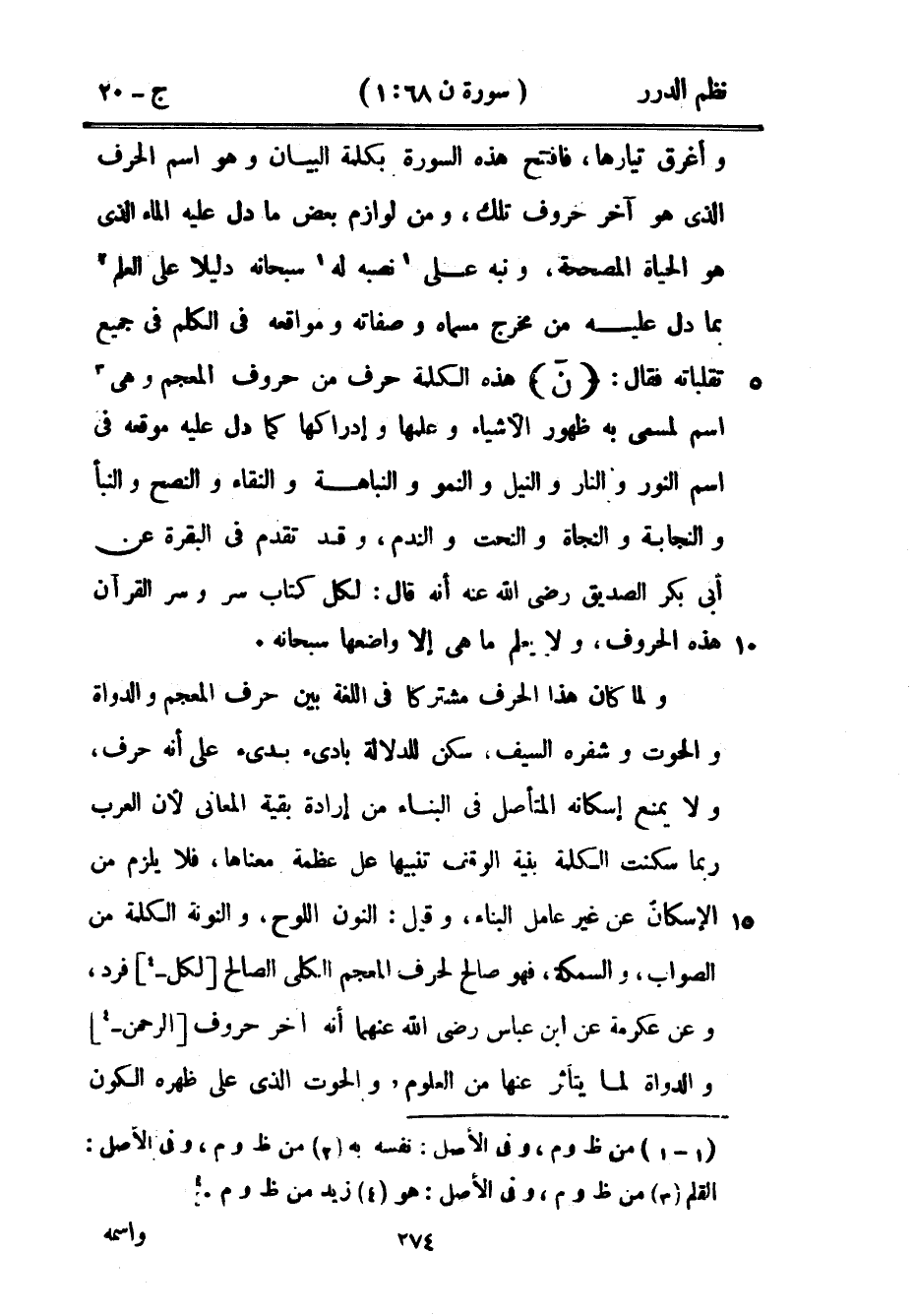 ولما كان هذا الحرف مشتركاً في اللغة بين حرف المعجم والدواة والحوت وشفرة السيف، سكن للدلالة بادىء بدء على أنه حرف، ولا يمنع إسكانه المتأصل في البناء من إرادة بقية المعاني لأن العرب ربما سكنت الكلمة بنية الوقف تنبيهاً على عظمة معناها، فلا يلزم من الإسكان عن غير عامل البناء، وقيل: النون اللوح، والنونة الكلمة من الصواب، والسمكة، فهو صالح لحرف المعجم الكلي الصالح لكل فرد، وعن عكرمة عن ابن عباس رضي الله عنهما أنه أخر حروف الرحمن والدواة لما يتأثر عنها من العلوم، والحوت الذي على ظهره الكون