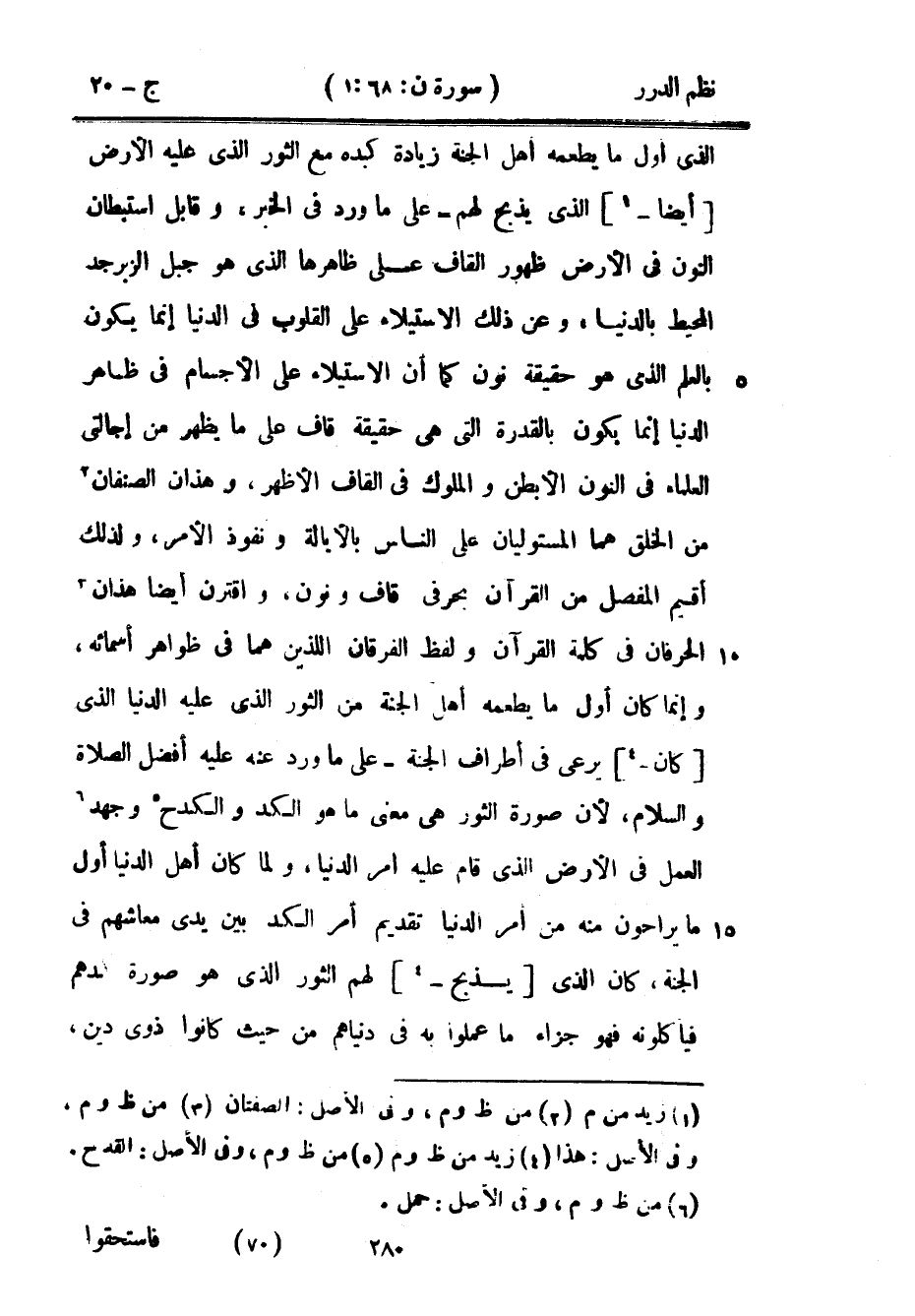 الذي أول ما يطعمه أهل الجنة زيادة كبده مع الثور الذي عليه الأرض أيضاً الذي يذبح لهم - على ما ورد في الخبر، وقابل استبطان النون في الأرض ظهور القاف على ظاهرها الذي هو جبل الزبرجد المحيط بالدنيا، وعن ذلك الاستيلاء على القلوب في الدنيا إنما يكون بالعلم الذي هو حقيقة نون كما أن الاستيلاء على الأجسام في ظاهر الدنيا إنما يكون بالقدرة التي هي حقيقة قاف على ما يظهر من إجالتي العلماء في النون الأبطن والملوك في القاف الأظهر، وهذان الصنفان من الخلق هما المستوليان على الناس بالأيالة ونفوذ الأمر، ولذلك أقيم المفصل من القرآن بحرفي قاف ونون، واقترن أيضاً هذان الحرفان في كلمة القرآن ولفظ الفرقان اللذين هما في ظواهر أسمائه، وإنما كان أول ما يطعمه أهل الجنة من الثور الذي عليه الدنيا الذي كان يرعى في أطراف الجنة - على ما ورد عنه عليه أفضل الصلاة والسلام، لأن صورة الثور هي معنى ما هو الكد والكدح وجهد العمل في الأرض الذي قام عليه أمر الدنيا، ولما كان أهل الدنيا أول ما يراحون منه من أمر الدنيا تقديم أمر الكد بين يدي معاشهم في الجنة، كان الذي يذبح لهم الثور الذي هو صورة كدهم فيأكلونه فهو جزاء ما عملوا به في دنياهم من حيث كانوا ذوي دين،