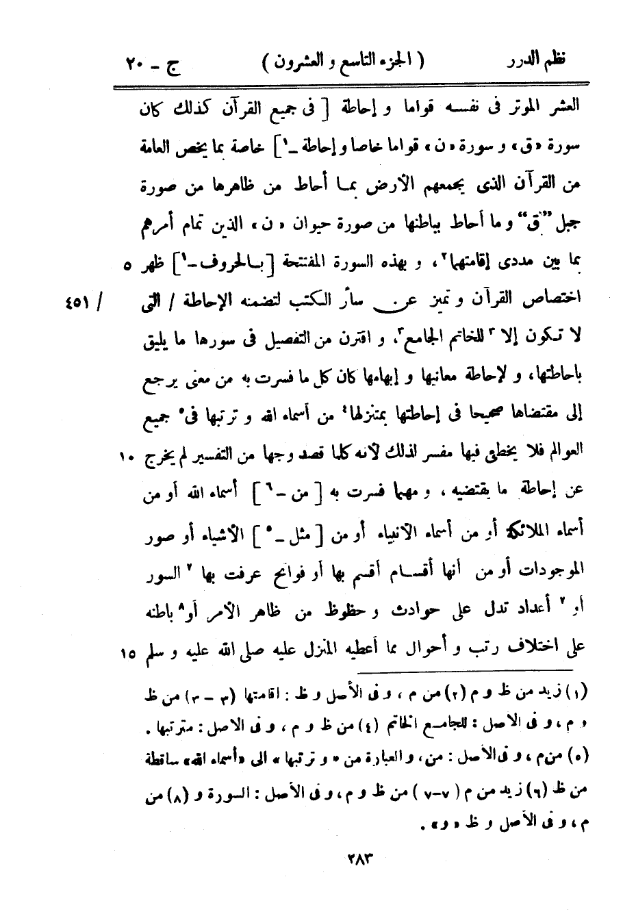 العشر الموتر في نفسه قواماً وإحاطة في جميع القرآن كذلك كان سورة «ق» وسورة «ن» قواماً خاصاً وإحاطة خاصة بما يخص العامة من القرآن الذي يجمعهم الأرض بما أحاط من ظاهرها من صورة جبل «ق» وما أحاط بباطنها من صورة حيوان «ن» الذين تمام أمرهم بما بين مددي إقامتهما، وبهذه السورة المفتتحة بالحروف ظهر اختصاص القرآن وتميز عن سائر الكتب لتضمنه الإحاطة التي لا تكون إلا للخاتم الجامع، واقترن من التفصيل في سورها ما يليق بإحاطتها، ولإحاطة معانيها وإبهامها كان كل ما فسرت به من معنى يرجع إلى مقتضاها صحيحاً في إحاطتها بمتنزلها من أسماء الله وترتبها في جميع العوالم فلا يخطىء فيها مفسر لذلك لأنه كلما قصد وجهاً من التفسير لم يخرج عن إحاطة ما يقتضيه، ومهما فسرت به من أسماء الله أو من أسماء الملائكة أو من أسماء الأنبياء أو من مثل الأشياء أو صور الموجودات أو من أنها أقسام أقسم بها أو فواتح عرفت بها السور أو أعداد تدل على حوادث وحظوظ من ظاهر الأمر أو باطنه على اختلاف رتب وأحوال مما أعطيه المنزل عليه صَلَّى اللهُ عَلَيْهِ وَسَلَّمَ