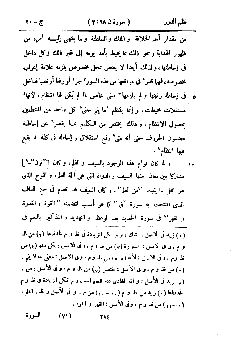 من مقدار أمد الخلافة والملك والسلطنة وما ينتهي إليه أمره من ظهور الهداية ونحو ذلك مما يحيط بأمد يومه إلى غير ذلك وكل داخل في إحاطتها، ولذلك أيضاً لا يختص بمحل مخصوص يلزمه علامة إعراب مخصوصة، فمهما قدر في مواقعها من هذه السورة جراً أو رفعاً أو نصباً فداخل في إحاطة رتبتها ولم يلزمها معنى خاص لما لم يكن لها انتظام، لأنها مستقلات محيطات، وإنما ينتظم ما يتم معنى كل واحد من المنتظمين بحصول الانتظام، وذلك يختص من الكلم بما يقصر عن إحاطة مضمون الحروف حتى أنه متى وقع استقلال وإحاطة في كلمة لم يقع فيها انتظام.