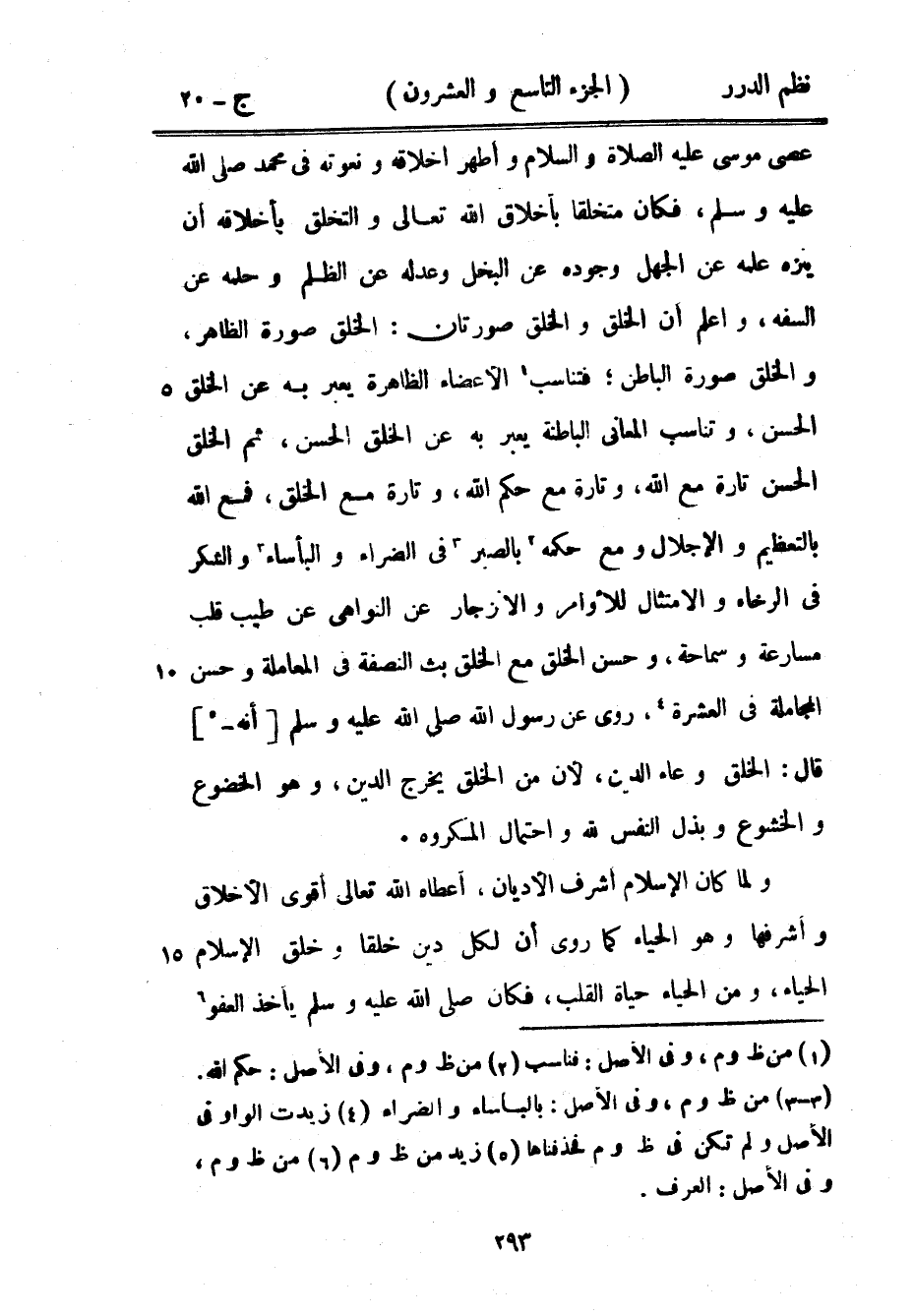 عصى موسى عليه الصلاة والسلام وأطهر أخلاقه ونعوته في محمد صَلَّى اللهُ عَلَيْهِ وَسَلَّمَ فكان متخلقاً بأخلاق الله تعالى والتخلق بأخلاقه أن ينزه علمه عن الجهل وجوده عن البخل وعدله عن الظلم وحلمه عن السفه، واعلم أن الخلق والخلق صورتان: الخلق صورة الظاهر، والخلق صورة الباطن؛ فتناسب الأعضاء الظاهرة يعبر به عن الخلق الحسن، وتناسب المعاني الباطنة يعبر به عن الخلق الحسن، ثم الخلق الحسن تارة مع الله، وتارة مع حكم الله، وتارة مع الخلق، فمع الله بالتعظيم والإجلال ومع حكمه بالصبر في الضراء والبأساء والشكر في الرخاء والامتثال للأوامر والانزجار عن النواهي عن طيب قلب مسارعة وسماحة، وحسن الخلق مع الخلق بث النصفة في المعاملة وحسن المجاملة في العشرة، روي عن رسول الله صَلَّى اللهُ عَلَيْهِ وَسَلَّمَ أنه قال: