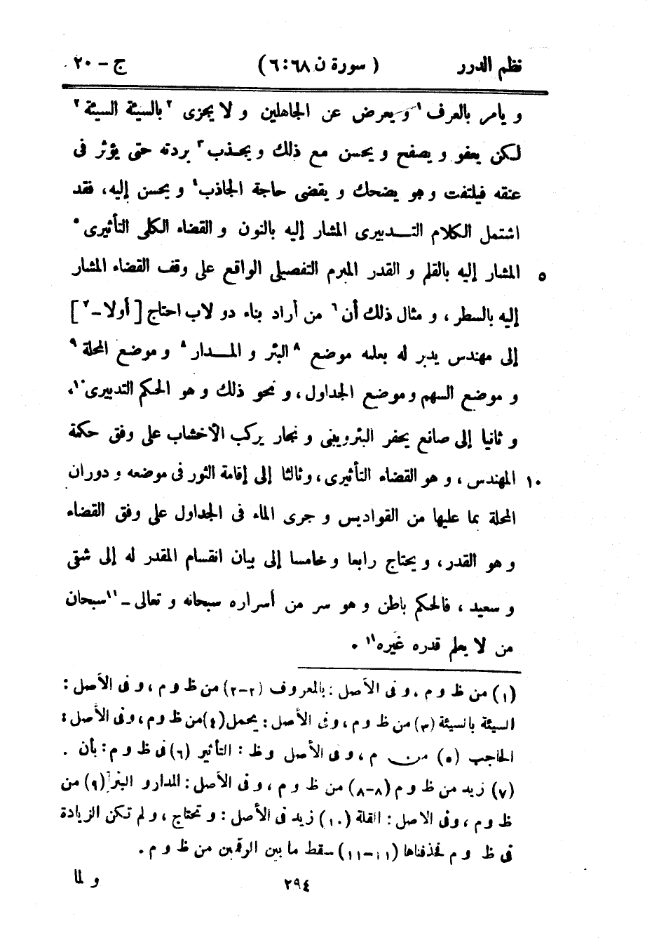 ويأمر بالعرف ويعرض عن الجاهلين ولا يجزي بالسيئة السيئة لكن يعفو ويصفح ويحسن مع ذلك ويجذب بردته حتى يؤثر في عنقه فيلتفت وهو يضحك ويقضي حاجة الجاذب ويحسن إليه، فقد اشتمل الكلام التدبيري المشار إليه بالنون والقضاء الكلي التأثيري المشار إليه بالقلم والقدر المبرم التفصيلي الواقع على وقف القضاء المشار إليه بالسطر، ومثال ذلك أن من أراد بناء دولاب احتاج أولاً إلى مهندس يدبر له بعلمه موضع البئر والمدار وموضع المحلة وموضع السهم وموضع الجداول، ونحو ذلك وهو الحكم التدبيري، ثانياً إلى صانع يحفر البئر ويبني ونجار يركب الأخشاب على وفق حكمة المهندس، وهو القضاء التأثيري، وثالثاً إلى إقامة الثور في موضعه ودوران المحلة بما عليها من القواديس وجري الماء في الجداول على وفق القضاء وهو القدر، ويحتاج رابعاً وخامساً إلى بيان انقسام المقدر له إلى شقي وسعيد، فالحكم باطن وهو سر من أسراره سبحانه وتعالى - سبحان من لا يعلم قدره غيره.