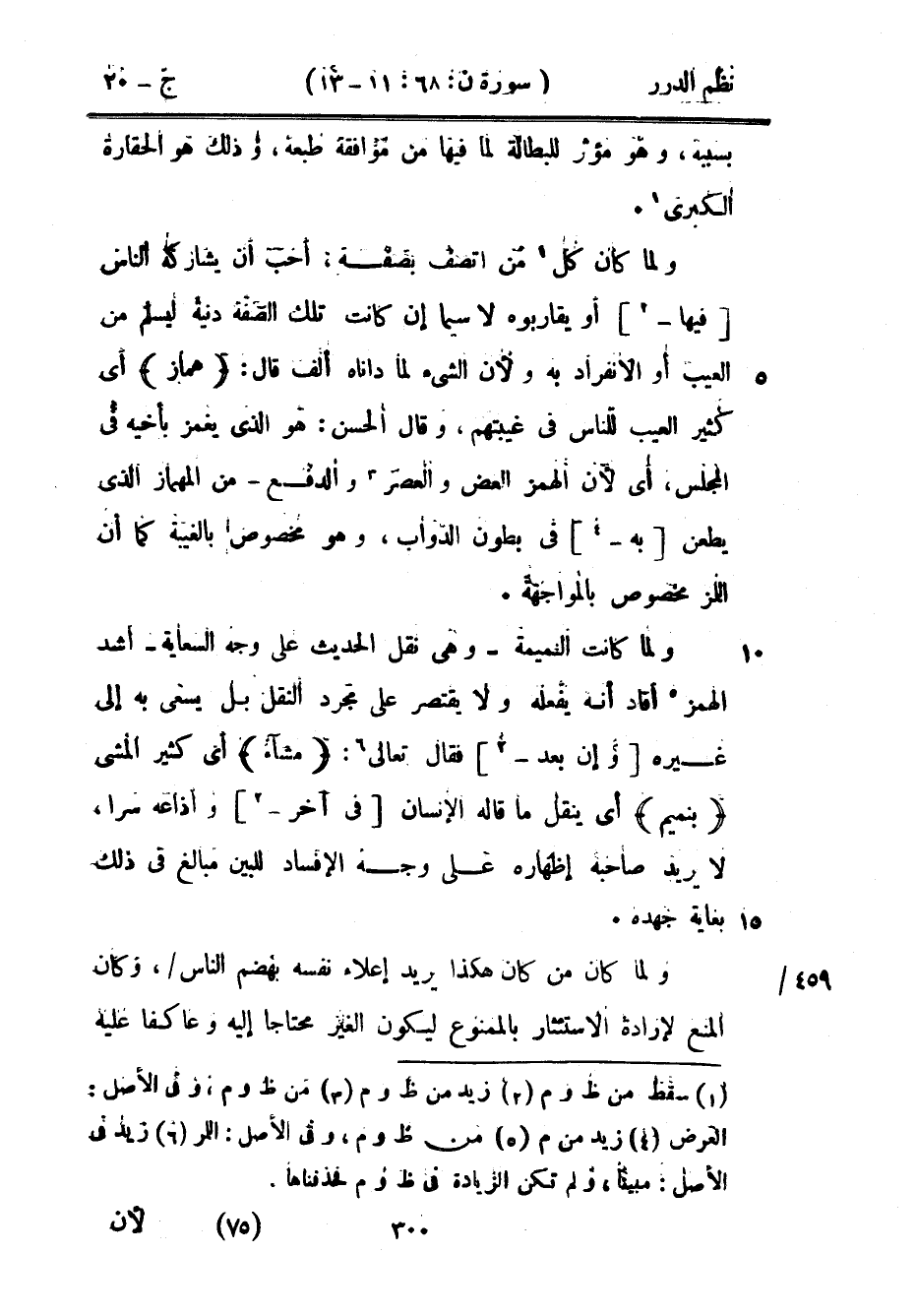 ولما كانت النميمة - وهي نقل الحديث على وجه السعاية - أشد الهمز أفاد أنه يفعله ولا يقتصر على مجرد النقل بل يسعى به إلى غيره وإن بعد فقال تعالى: {مشاء} أي كثير المشي {بنميم} أي ينقل ما قاله الإنسان في آخر وأذاعه سراً، لا يريد صاحبه إظهاره على وجه الإفساد للبين مبالغ في ذلك بغاية جهده.