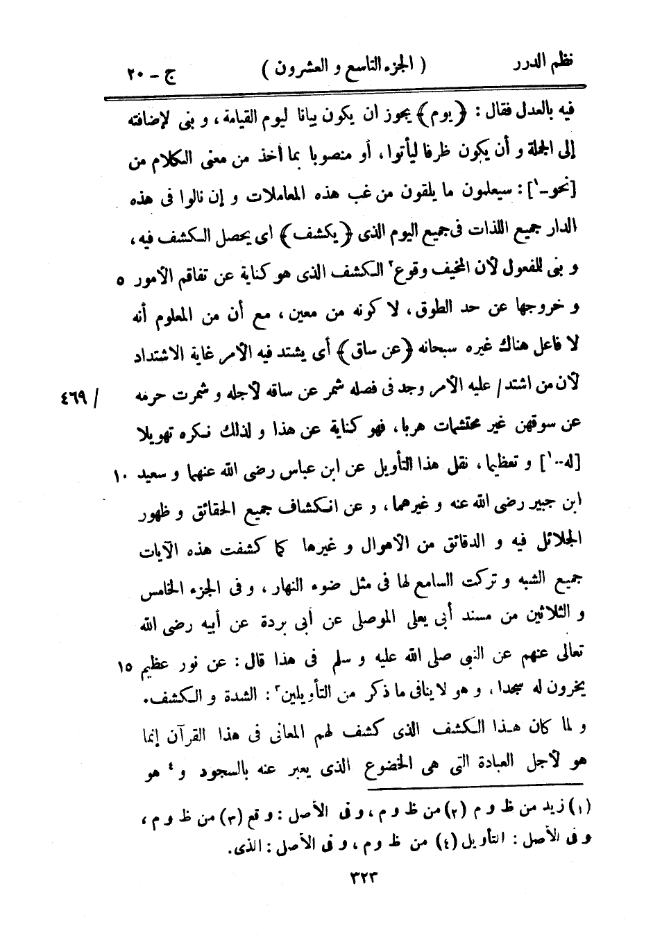 «عن نور عظيم يخرون له سجداً» وهو لا ينافي ما ذكر من التأويلين: الشدة والكشف. ولما كان هذا الكشف الذي كشف لهم المعاني في هذا القرآن إنما هو لأجل العبادة التي هي الخضوع الذي يعبر عنه بالسجود وهو