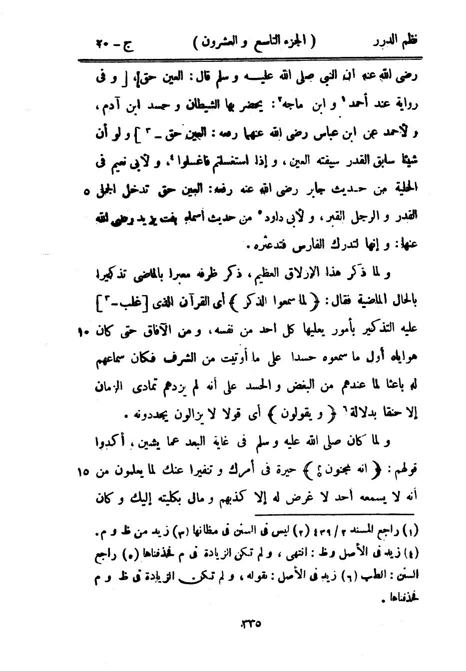 «العين حق» وفي رواية عند أحمد وابن ماجة: «يحضر بها الشيطان وحسد ابن آدم» ولأحمد عن ابن عباس رضي الله عنهما رفعه: «العين حق ولو أن شيئاً سابق القدر سبقته العين، وإذا استغسلتم فاغسلوا» ولأبي نعيم في الحلية من حديث جابر رضي الله عنه رفعه: «العين حق تدخل الجمل القدر والرجل القبر» ولأبي داود من حديث أسماء بنت يزيد رضي الله عنها: «وإنها لتدرك الفارس فتدعثره» .