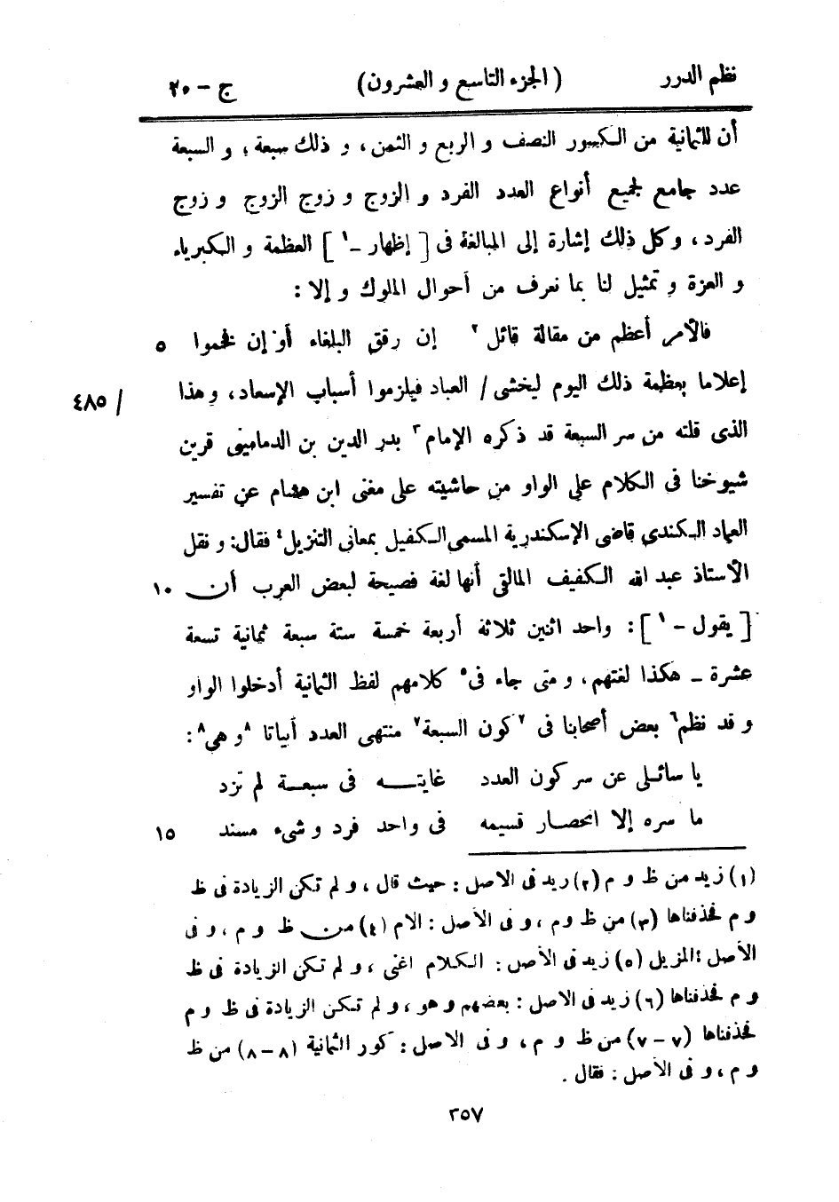 إعلاماً بعظمة ذلك اليوم ليخشى العباد فيلزموا أسباب الإسعاد، وهذا الذي قلته من سر السبعة قد ذكره الإمام بدر الدين بن الدماميني قرين شيوخنا في الكلام على الواو من حاشيته على مغني ابن هشام عن تفسير العماد الكندي قاضي الإسكندرية المسمى الكفيل بمعاني التنزيل فقال: ونقل الأستاذ عبد الله الكفيف المالقي أنها لغة فصيحة لبعض العرب أن يقول: واحد اثنين ثلاثة أربعة خمسة ستة سبعة ثمانية تسعة عشرة - هكذا لغتهم، ومتى جاء في كلامهم لفظ الثمانية أدخلوا الواو وقد نظم بعض أصحابنا في كون السبعة منتهى العدد أبياتاً وهي: