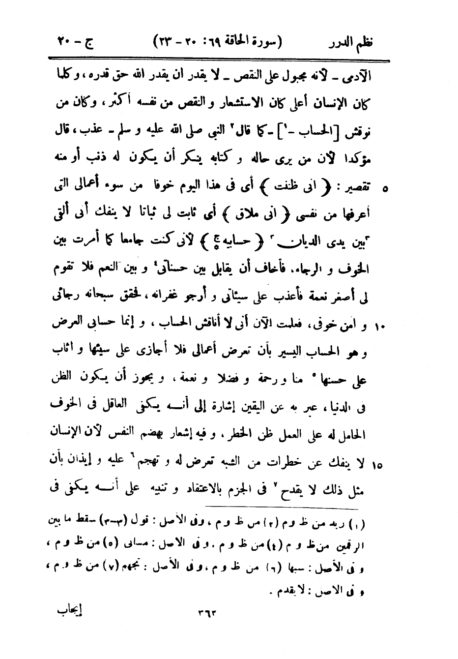 الآدمي - لأنه مجبول على النقص - لا يقدر أن يقدر الله حق قدره، وكلما كان الإنسان أعلى كان الاستشعار والنقص من نفسه أكثر، وكان من نوقش الحساب - كما قال النبي صَلَّى اللهُ عَلَيْهِ وَسَلَّمَ - عذب، قال مؤكداً لأن من يرى حاله وكتابه ينكر أن يكون له ذنب أو منه تقصير: {إني ظننت} أي في هذا اليوم خوفاً من من سوء أعمالي التي أعرفها من نفسي {أني ملاق} أي ثابت لي ثباتاً لا ينفك أني ألقى بين يدي الديان {حسابيه *} لأني كنت جامعاً كما أمرت بين الخوف والرجاء، فأخاف أن يقابل بين حسناتي وبين النعم فلا تقوم لي أصغر نعمة فأعذب على سيئاتي وأرجو غفرانه، فحقق سبحانه رجائي وأمن خوفي، فعلمت الآن أني لا أناقش الحساب، وإنما حسابي العرض وهو الحساب اليسير بأن تعرض أعمالي فلا أجازى على سيئها وأثاب على حسنها مناً ورحمة وفضلاً ونعمة، ويجوز أن يكون الظن في الدنيا، عبر به عن اليقين إشارة إلى أنه يكفي العاقل في الخوف الحامل له على العمل ظن الخطر، وفيه إشعار بهضم النفس لأن الإنسان لا ينفك عن خطرات من الشبه تعرض له وتهجم عليه وإيذان بأن مثل ذلك لا يقدح في الجزم بالاعتقاد وتنبيه على أنه يكفي في