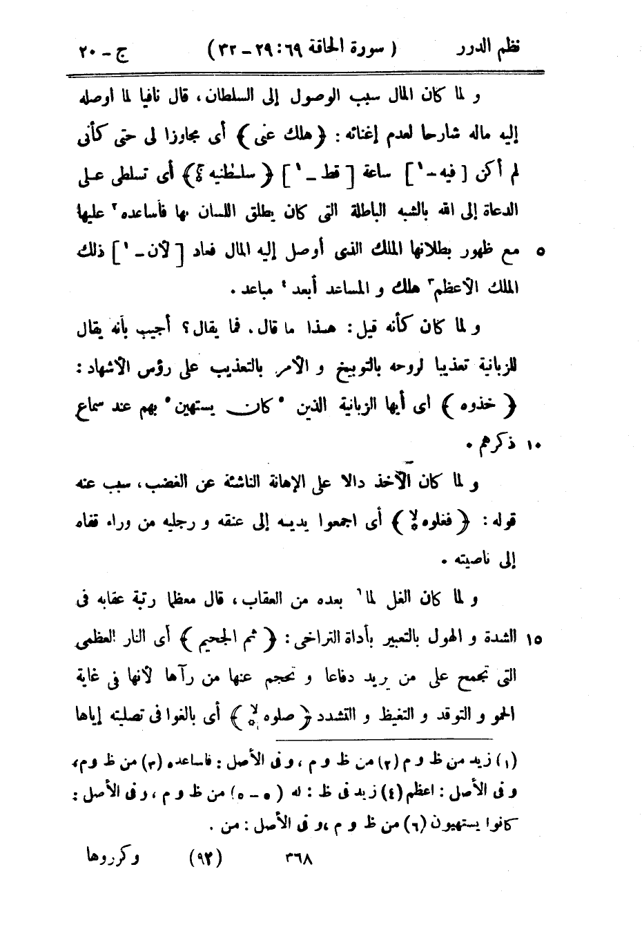 ولما كان المال سبب الوصول إلى السلطان، قال نافياً لما أوصله إليه ماله شارحاً لعدم إغنائه، {هلك عني} أي مجاوزاً لي حتى كأني لم أكن فيه ساعة قط {سلطانيه *} أي تسلطي على الدعاة إلى الله بالشبه الباطلة التي كان يطلق اللسان بها فأساعده عليها مع ظهور بطلانها الملك الذي أوصل إليه المال فعاد لأن ذلك الملك الأعظم هلك والمساعد أبعد مباعد.