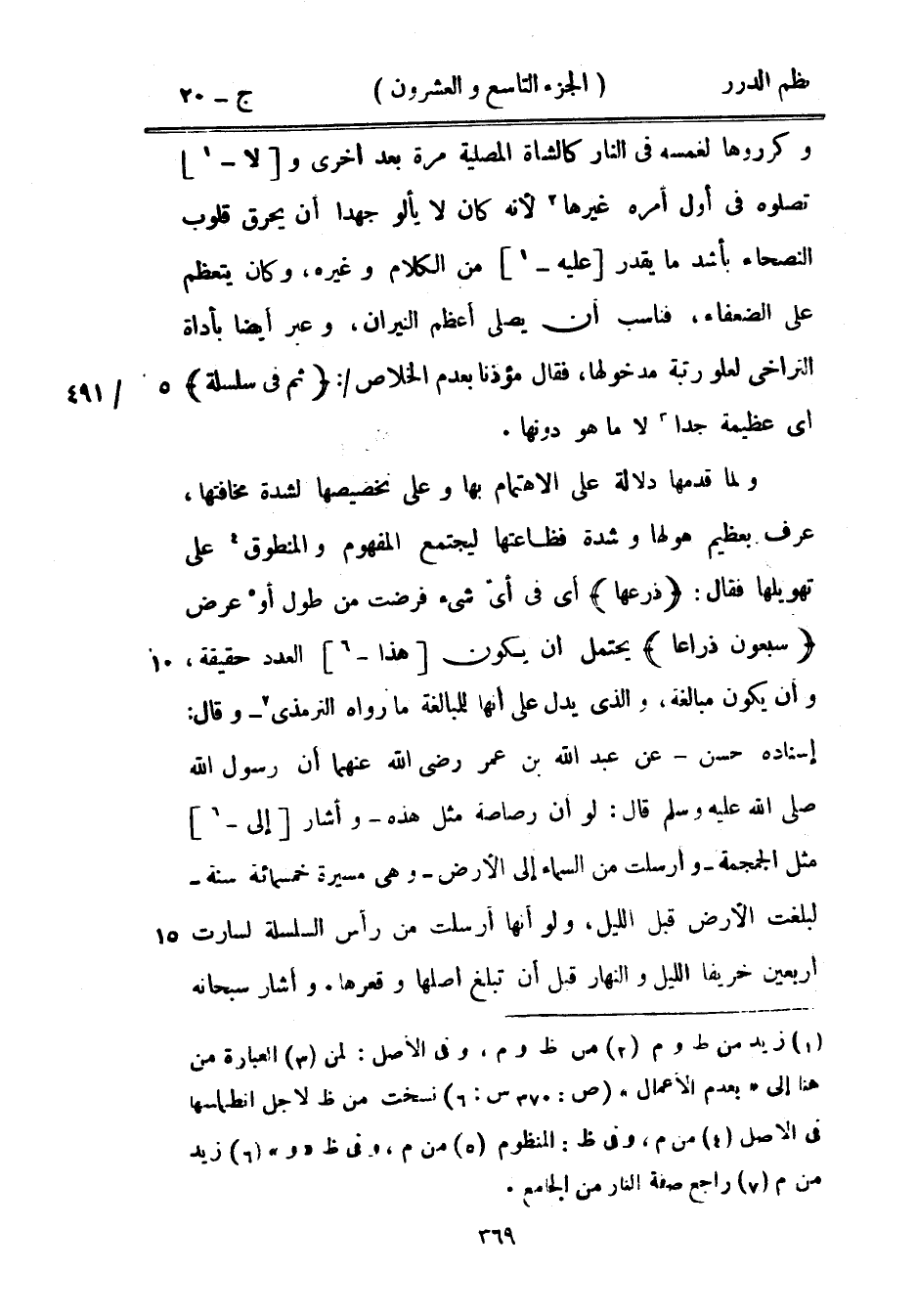 ولما قدمها دلالة على الاهتمام بها وعلى تخصيصها لشدة مخافتها، عرف بعظيم هولها وشدة فظاعتها ليجتمع المفهوم والمنطوق على تهويلها فقال: {ذرعها} أي في أيّ شيء فرضت من طول أو عرض {سبعون ذراعاً} يحتمل أن يكون هذا العدد حقيقة، وأن يكون مبالغة، والذي يدل على أنها للمبالغة ما رواه الترمذي - وقال: إسناده حسن - عن عبد الله بن عمرو رضي الله عنهما أن رسول الله صَلَّى اللهُ عَلَيْهِ وَسَلَّمَ قال: «لو أن رصاصة مثل هذه - وأشار إلى مثل الجمجمة - وأرسلت من السماء إلى الأرض - وهي مسيرة خمسمائة سنة - لبلغت الأرض قبل الليل، ولو أنها أرسلت من رأس السلسلة لسارت أربعين خريفاً الليل والنهار قبل أن تبلغ أصلها وقعرها» وأشار سبحانه