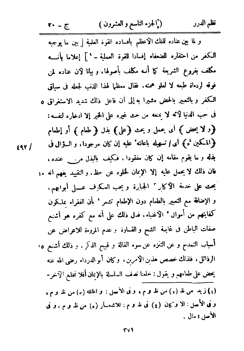 ولما بين عناده للملك الأعظم بإفساده القوة العلمية بين ما يوجبه الكفر من احتقاره للضعفاء إفساداً للقوة العملية إعلاماً بأنه مكلف بفروع الشريعة كما أنه مكلف بأصولها، وبياناً لأن عناده لمن فوقه لرداءة طبعه لا لعلو همته، فقال معظماً لهذا الذنب لجعله في سياق الكفر وبالتعبير بالحض مشيراً به إلى أن فاعل ذلك شديد الاستغراق في حب الدنيا لأنه لا يمنعه من حث غيره على الخير إلا ادخاره لنفسه: {ولا يحض} أي يحمل ويحث {على} بذل {طعام} أو إطعام {المسكين *} أي تسهيله بإعانته عليه إن كان موجوداً، والسؤال في بذله وما يقوم مقامه إن كان مفقوداً، فكيف بالبذل من عنده، فإن ذلك لا يحمل عليه إلا الإيمان لخلوه عن حظ، والتقييد يفهم أنه يحث على خدمة الأكابر الجبابرة ويحب العكوف على أبوابهم والإضافة مع التعبير بالطعام دون الإطعام تشعر بأن الفقراء يملكون كفايتهم من أموال الأغنياء، فدل ذلك على أنه مع كفره هو أشنع صفات الباطن في غاية الشح والقساوة وعدم المروءة للإعراض عن أسباب التمدح وعن التنزه عن سوء القالة وقبيح الذكر، وذلك أشنع الرذائل، فلذلك خصص هذين الأمرين، وكان أبو الدرداء رضي الله عنه يحض على طعامهم ويقول: خلعنا نصف السلسة بالإيمان أفلا نخلع الآخر -