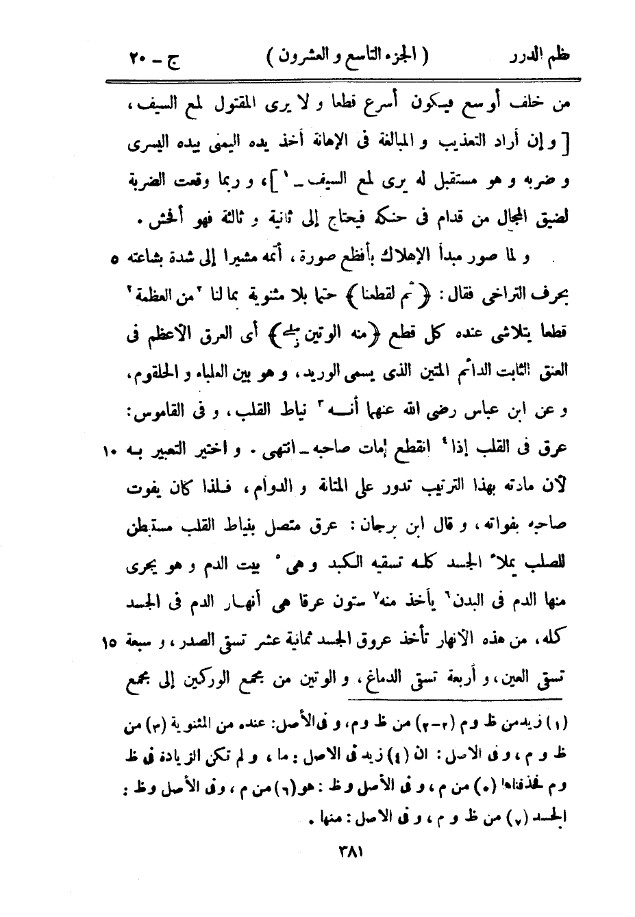 ولما صور مبدأ الإهلاك بأفظع صورة، أتمه مشيراً إلى شدة بشاعته بحرف التراخي فقال: {ثم لقطعنا} حتماً بلا مثنوية بما لنا من العظمة قطعاً يتلاشى عنده كل قطع {منه الوتين} أي العرق الأعظم في العنق الثابت الدائم المتين الذي يسمى الوريد، وهو بين العلباء والحلقوم، وعن ابن عباس رضي الله عنهما أنه نياط القلب، وفي القاموس: عرق في القلب إذا انقطع مات صاحبه - انتهى. واختير التعبير به لأن مادته بهذا الترتيب تدور على المتانة والدوام، فلذا كان يفوت صاحبه بفواته، وقال ابن برجان: عرق متصل بنياط القلب مستبطن للصلب يملأ الجسد كله تسقيه الكبد وهي بيت الدم وهو يجري منها الدم في البدن يأخذ منه ستون عرقاً هي أنهار الدم في الجسد كله، من هذه الأنهار تأخذ الجسد ثمانية عشر تسقي الصدر، وسبعة تسقي العين، وأربعة تسقي الدماغ، والوتين من مجمع الوركين إلى مجمع