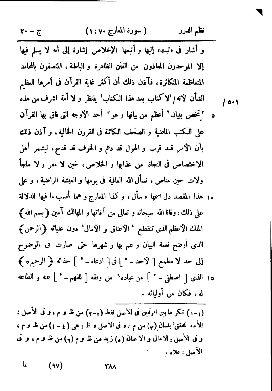 وأشار في " تبت " إليها وأتبعها الإخلاص إشارة إلى أنه لا يسلم فيها إلا الموحدون المعاذون من الفتن الظاهرة والباطنة، المتصفون بالمحامد المتعاظمة المتكاثرة، فآذن ذلك أن أكثر غاية القرآن في أمرها العظيم الشأن لأنه لا كتاب بعد هذا الكتاب ينتظر ولا أمة أشرف من هذه تخص ببيان أعظم من بيانها وهو أحد الأوجه التي فاق بها القرآن على الكتب الماضية والصحف الكائنة في القرون الخالية، وآذن ذلك بأن الأمر قد قرب والهول قد دهم والخوف قد قدح، ليشمر أهل الاختصاص في النجاة من عذابها والخلاص حين لا مفر ولا ملجأ ولات حين مناص، نسأل الله العافية في يومها والعيشة الراضية، وعلى هذا المقصد دل اسمها " سأل " وكذا المعارج وهما أنسب ما فيها للدلالة على ذلك، وقانا الله سبحانه وتعالى من آفاتها والمهالك آمين) بسم الله (الملك الأعظم الذي تنقطع الأعناق والآمال دون عليائه) الرحيم (الذي أوضح نعمة البيان وعم بها وشهرها حتى صارت في الوضوح إلى حد لا مطمع لأحد في ادعاء خفائه) الرحيم (الذي اصطفى من عباده من وفقهم للفهم عنه والطاعة له، فكان من أوليائه.