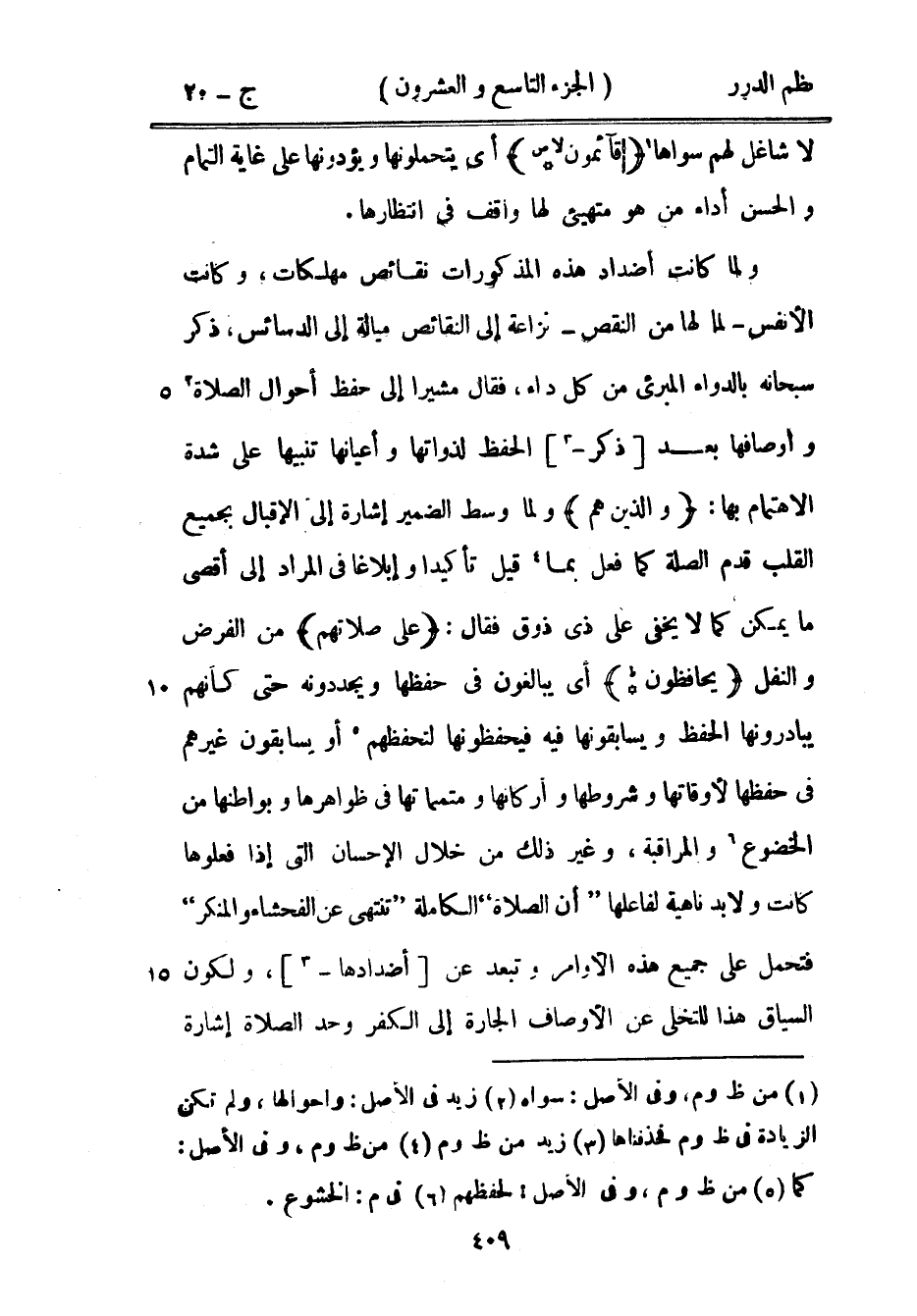 ولما كانت أضداد هذه المذكورات نقائص مهلكات، وكانت الأنفس - لما لها من النقص - نزاعة إلى النقائص ميالة إلى الدسائس، ذكر سبحانه بالدواء المبرىء من كل داء، فقال مشيراً إلى حفظ أحوال الصلاة وأوصافها بعد ذكر الحفظ لذواتها وأعيانها تنبيهاً على شدة الاهتمام بها: {والذين هم} ولما وسط الضمير إشارة إلى الإقبال بجميع القلب قدم الصلة كما فعل بما قيل تأكيداً وإبلاغاً في المراد إلى أقصى ما يمكن كما لا يخفى على ذي ذوق فقال: {على صلاتهم} من الفرض والنقل {يحافظون *} أي يبالغون في حفظها ويجددونه حتى كأنهم يبادرونها الحفظ ويسابقونها فيه فيحفظونها لتحفظهم أو يسابقون غيرهم في حفظها لأوقاتها وشروطها وأركانها ومتمماتها في ظواهرها وبواطنها من الخضوع والمراقبة، وغير ذلك من خلال الإحسان التي إذا فعلوها كانت ولا بد ناهية لفاعلها «أن الصلاة» الكاملة «تنهى عن الفحشاء والمنكر» فتحمل على جميع هذه الأوامر وتبعد عن أضدادها، ولكون السياق هذا للتخلي عن الأوصاف الجارة إلى الكفر وحد الصلاة إشارة
