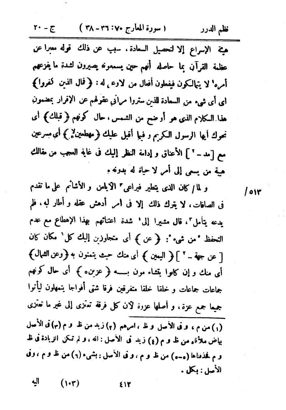 ولما كان الذي يتطير فيراعي الأيامن والأشائم على ما تقدم في الصافات، لا يترك ذلك إلا في أمر أدهش عقله وأطار لبه، فلم يدعه يتأمل، قال مشيراً إلى شدة اعتنائهم بهذا الإهطاع مع عدم التحفظ من شيء: {عن} أي متجاوزين إليك كل مكان كان عن جهة {اليمين} أي منك حيث يتمنون به {وعن الشمال} أي منك وإن كانوا يتشاءمون به {عزين *} أي حال كونهم جماعات جماعات وخلقاً خلقاً متفرقين فرقاً شتى أفواجاً يتمهلون ليأتوا جميعاً جمع عزة، وأصلها عزوة لأن كل فرقة تعتزي إلى غير ما تعتزي