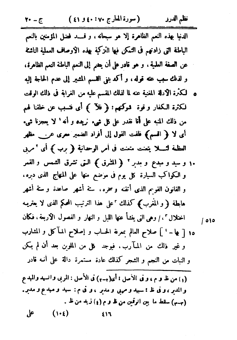 الدنيا بهذه النعم الظاهرة إلا هو سبحانه، وقد فضل المؤمنين بالنعم الباطنة التي زادتهم في التمكن فيها التزكية بهذه الأوصاف العملية الناشئة عن الصفة العلمية، وهو قادر على أن يضم إلى النعم الباطنة النعم الظاهرة، ولذلك سبب عنه قوله: وأكد بنفي القسم المشير إلى عدم الحاجة إليه لكثرة الأدلة المغنية عنه لما لذلك المقسم عليه من الغرابة في ذلك الوقت لكثرة الكفار وقوة شوكتهم: {فلا} أي فتسبب عن خلقنا لهم من ذلك المنبه على أنا نقدر على كل شيء نريده وأنه لا يعجزنا شيء أي لا {أقسم} فلفت القول إلى أفراد الضمير معرى عن مظهر العظمة لئلا يتعنت متعنت في أمر الواحدانية {برب} أي مربي وسيد ومبدع ومدبر {المشارق} التي تشرق الشمس والقمر والكواكب السيارة كل يوم في موضع منها على المنهاج الذي دبره، والقانون القويم الذي أتقنه وسخره، ستة أشهر صاعدة وستة أشهر هابطة {والمغارب} كذلك على هذا الترتيب المحكم الذي لا يعتريه اختلال، وهي التي ينشأ عنها الليل والنهار والفصول الأربعة، فكان بها صلاح العالم بمعرفة الحساب وإصلاح المآكل والمشارب وغير ذلك من المآرب، فيوجد كل من الملوين بعد أن لم يكن والنبات من النجم والشجر كذلك عادة مستمرة دالة على أنه قادر