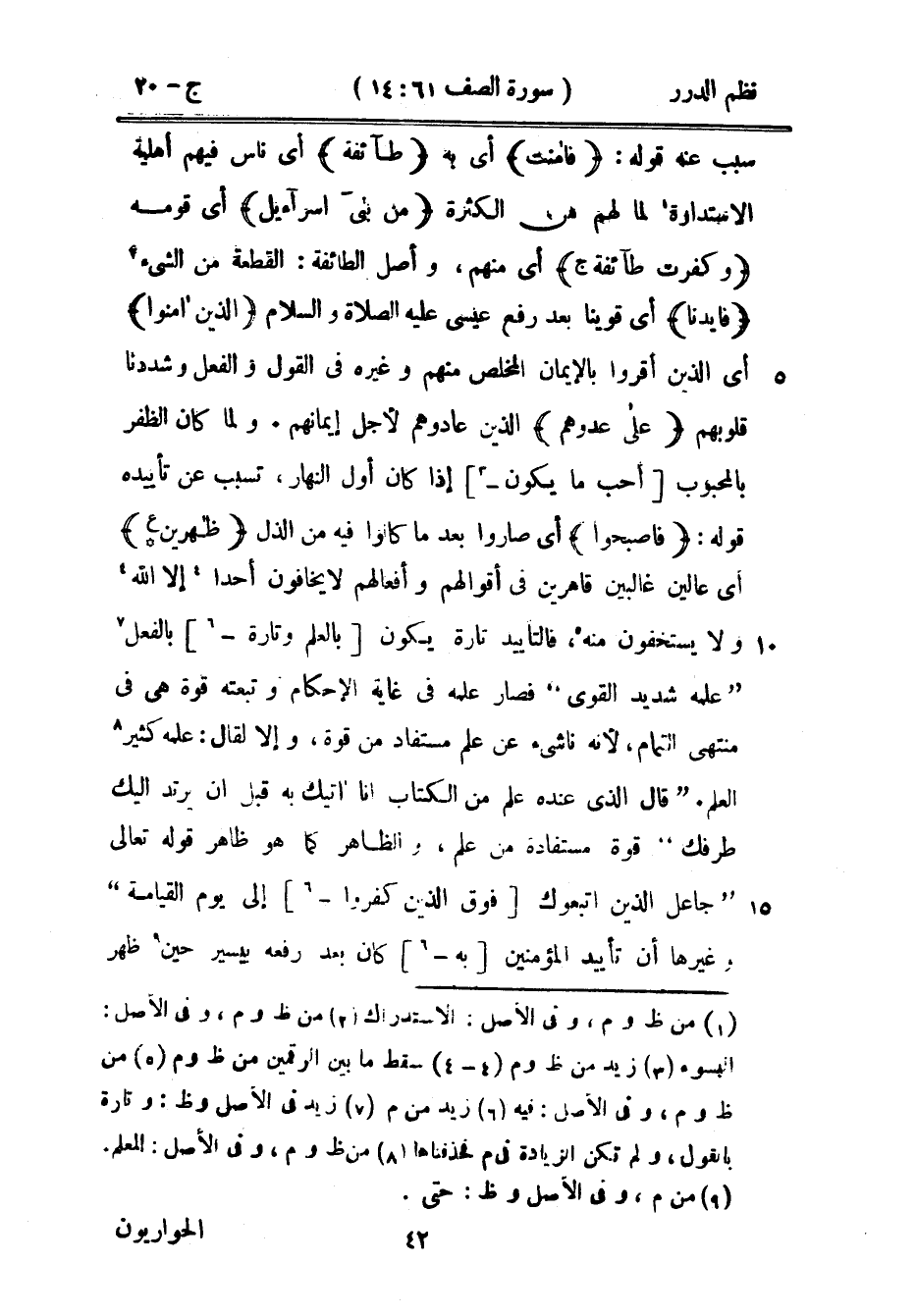 سبب عنه قوله: {فآمنت} أي به {طائفة} أي ناس فيهم أهلية الاستدارة لما لهم من الكثرة {من بني إسرائيل} أي قومه {وكفرت طائفة} أي منهم، وأصل الطائفة: القطعة من الشيء {فأيدنا} أي قوينا بعد رفع عيسى عليه الصلاة والسلام {الذين آمنوا} أي الذين أقروا بالإيمان المخلص منهم وغيره في القول والفعل وشددنا قلوبهم {على عدوهم} الذين عادوهم لأجل إيمانهم. ولما كان الظفر بالمحبوب أحب ما يكون إذا كان أول النهار، تسبب عن تأييده قوله: {فأصبحوا} أي صاروا بعد ما كانوا فيه من الذل {ظاهرين *} أي عالين غالبين قاهرين في أقوالهم وأفعالهم لا يخافون أحداً إلا الله ولا يستخفون منه، فالتأييد تارة يكون بالعلم وتارة بالفعل {علمه شديد القوى} [النجم: 5] فصار علمه في غاية الإحكام وتبعته قوة هي في منتهى التمام، لأنه ناشىء عن علم مستفاد من قوة، وإلا لقال: علمه كثير العلم. {قال الذي عنده علم من الكتاب أنا آتيك به قبل أن يرتد إليك طرفك} [النمل: 40] قوة مستفادة من علم، والظاهر كما هو ظاهر قوله تعالى: {جاعل الذين اتبعوك فوق الذين كفروا إلى يوم القيامة} [آل عمران: 55] وغيرها أن تأييد المؤمنين به كان بعد رفعه بيسير حين ظهر
