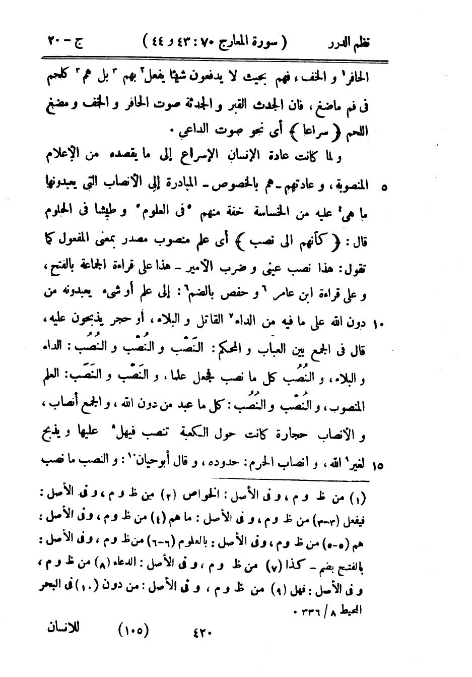 ولما كانت عادة الإنسان الإسراع إلى ما يقصده من الأعلام المنصوبة، وعادتهم - هم بالخصوص - المبادرة إلى الأنصاب التي يبعدونها ما هي عليه من الخساسة خفة منهم في العلوم وطيشاً في الحلوم قال: {كأنهم إلى نصب} أي علم منصوب مصدر بمعنى المفعول كما تقول: هذا نصب عيني وضرب الأمير - هذا على قراءة الجماعة بالفتح، وعلى قراءة ابن عامر وحفص بالضم: إلى علم أو شيء يعبدونه من دون الله على ما فيه من الداء القاتل والبلاء، أو حجر يذبحون عليه، قال في الجمع بين العباب والمحكم: النَصْب والنُصْب والنُصُب: الداء والبلاء: والنُصُب كل ما نصب فجعل علماً، والنَصْب والنَصَب: العلم المنصوب، والنُصْب والنُصُب: كل ما عبد من دون الله، والجمع أنصاب، والأنصاب حجارة كانت حول الكعبة تنصب فيهل عليها ويذبح عليها لغير الله، وانصاب الحرم: حدوده، وقال أبو حيان: والنصب ما نصب