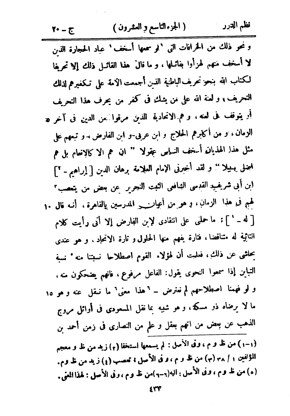 ونحو ذلك من الخرافات التي لو سمعها أسخف عباد الحجارة الذين لا أسخف منهم لهزؤوا بقائلها، وما قال هذا القائل ذلك إلا تحريفاً لكتاب الله بنحو تحريف الباطنية الذين أجمعت الأمة على تكفيرهم لذلك التحريف، ولعنة الله على من يشك في كفر من يحرف هذا التحريف أو يتوقف في لعنه، وهم الاتحادية الذين مرقوا من الدين في آخر الزمان، ومن أكابرهم الحلاج وابن عربي وابن الفارض، وتبعهم على مثل الهذيان أسخف الناس عقولاً