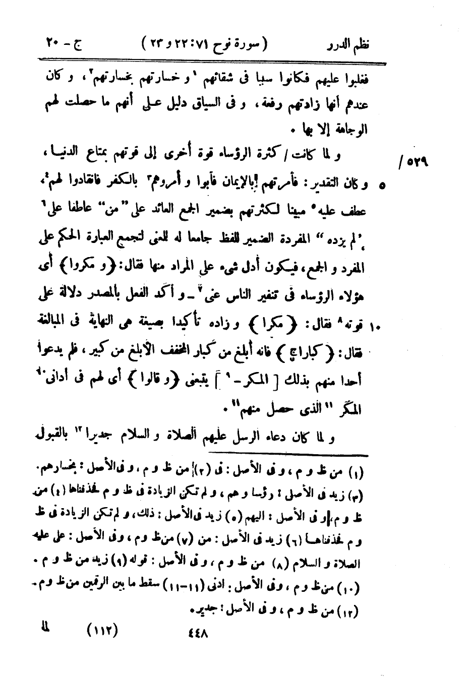 ولما كانت كثرة الرؤساء قوة أخرى إلى قوتهم بمتاع الدنيا، وكان التقدير: فأمرتهم بالإيمان فأبوا وأمروهم بالكفر فانقادوا لهم، عطف عليه مبيناً لكثرتهم بضمير الجمع العائد على «من» عاطفاً على «لم يزده» المفردة الضمير للفظ جامعاً له للمعنى لتجمع العبارة الحكم على المفرد والجمع، فيكون أدل شيء على المراد منها فقال: {ومكروا} أي هؤلاء الرؤساء في تنفير الناس عني - وأكد الفعل بالمصدر دلالة على قوته فقال: {مكراً} وزاده تأكيداً بصيغة هي النهاية في المبالغة فقال: {كباراً *} فإنه أبلغ من كبار المخفف الأبلغ من كبير، فلم يدعوا أحداً منهم بذلك المكر يتبعني {وقالوا} أي لهم في أداني المكر الذي حصل منهم.