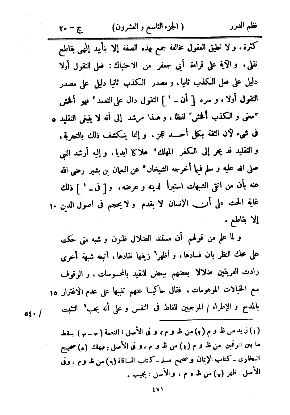 كثرة، ولا تطيق العقول مخالفة جمع بهذه الصفة إلا بتأييد إلهي بقاطع نقلي، والآية على قراءة أبي جعفر من الاحتباك: فعل التقول أولاً دليل على فعل الكذب ثانياً، ومصدر الكذب ثانياً دليل على مصدر التقول أولاً، وسره أن التقول دال على التعمد فهو أفحش معنى والكذب أفحش لفظاً، وهذا مرشد إلى أنه لا ينبغي التقليد في شيء لأن الثقة بكل أحد عجز، وإنما ينكشف ذلك بالتجربة، والتقليد قد يجر إلى الكفر المهلك هلاكاً أبدياً، وإليه أرشد النبي صَلَّى اللهُ عَلَيْهِ وَسَلَّمَ فيما أخرجه الشيخان عن النعمان ابن بشير رضي الله عنه بأن «من اتقى الشبهات استبرأ لديه وعرضه» وفي ذلك غاية الحث على أن الإنسان لا يقدم ولا يحجم في أصول الدين إلا بقاطع.