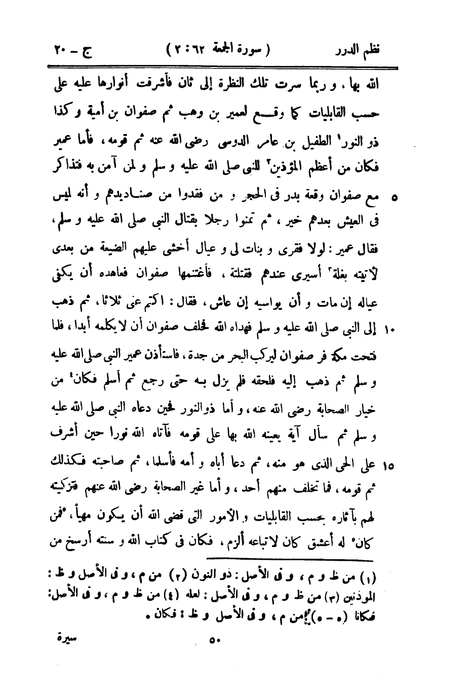الله بها، وربما سرت تلك النظرة إلى ثان فأشرقت أنوارها عليه على حسب القابليات كما وقع لعمير بن وهب ثم صفوان بن أمية وكذا ذو النور الطفيل بن عامر الدوسي رضي الله عنه ثم قومه، فأما عمير فكان من أعظم المؤذين للنبي صَلَّى اللهُ عَلَيْهِ وَسَلَّمَ ولمن آمن به فتذاكر مع صفوان وقعة بدر في الحجر ومن فقدوا من صناديدهم وأنه ليس في العيش بعدهم خير، ثم تمنوا رجلاً بقتال النبي صَلَّى اللهُ عَلَيْهِ وَسَلَّمَ، فقال عمير: لولا فقري وبنات لي وعيال أخشى عليهم الضيعة من بعدي لأتيته بغلة أسيري عندهم فقتلته، فاغتنمها صفوان فعاهده أن يكفي عياله إن مات وأن يواسيه إن عاش، فقال: اكتم عني ثلاثاً، ثم ذهب إلى النبي صَلَّى اللهُ عَلَيْهِ وَسَلَّمَ فهداه الله فحلف صفوان أن لا يكلمه أبداً، فلما فتحت مكة فر صفوان ليركب البحر من جدة، فاستأذن عمير النبي صَلَّى اللهُ عَلَيْهِ وَسَلَّمَ ثم ذهب إليه فلحقه فلم يزل به حتى رجع ثم أسلم فكان من خيار الصحابة رضي الله عنه، وأما ذو النور فحين دعاه النبي صَلَّى اللهُ عَلَيْهِ وَسَلَّمَ ثم سأل آية يعينه الله بها على قومه فآتاه الله نوراً حين أشرف على الحي الذي هو منه، ثم دعا أباه وأمه فأسلما، ثم صاحبته فكذلك ثم قومه، فما تخلف منهم أحد، وأما غير الصحابة رضي الله عنهم فتزكيته لهم بآثاره بحسب القابليات والأمور التي قضى الله أن يكون مهيأ، فمن كان له أعشق كان لاتباعه ألزم، فكان في كتاب الله وسنته أرسخ من