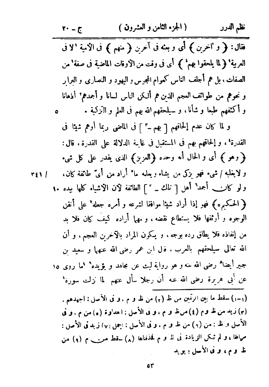 فقال: {وآخرين} أي وبعثه في آخرين {منهم} في الأمية لا في العربية {لما يلحقوا بهم} أي في وقت من الأوقات الماضية في صفة من الصفات، بل هم أجلف الناس كعوام المجوس واليهود والنصارى والبرابر ونحوهم من طوائف العجم الذين هم ألكن الناس لساناً وأجمدهم أذهاناً وأكثفهم طبعاً وشأناً، وسيلحقهم الله بهم في العلم والتزكية.