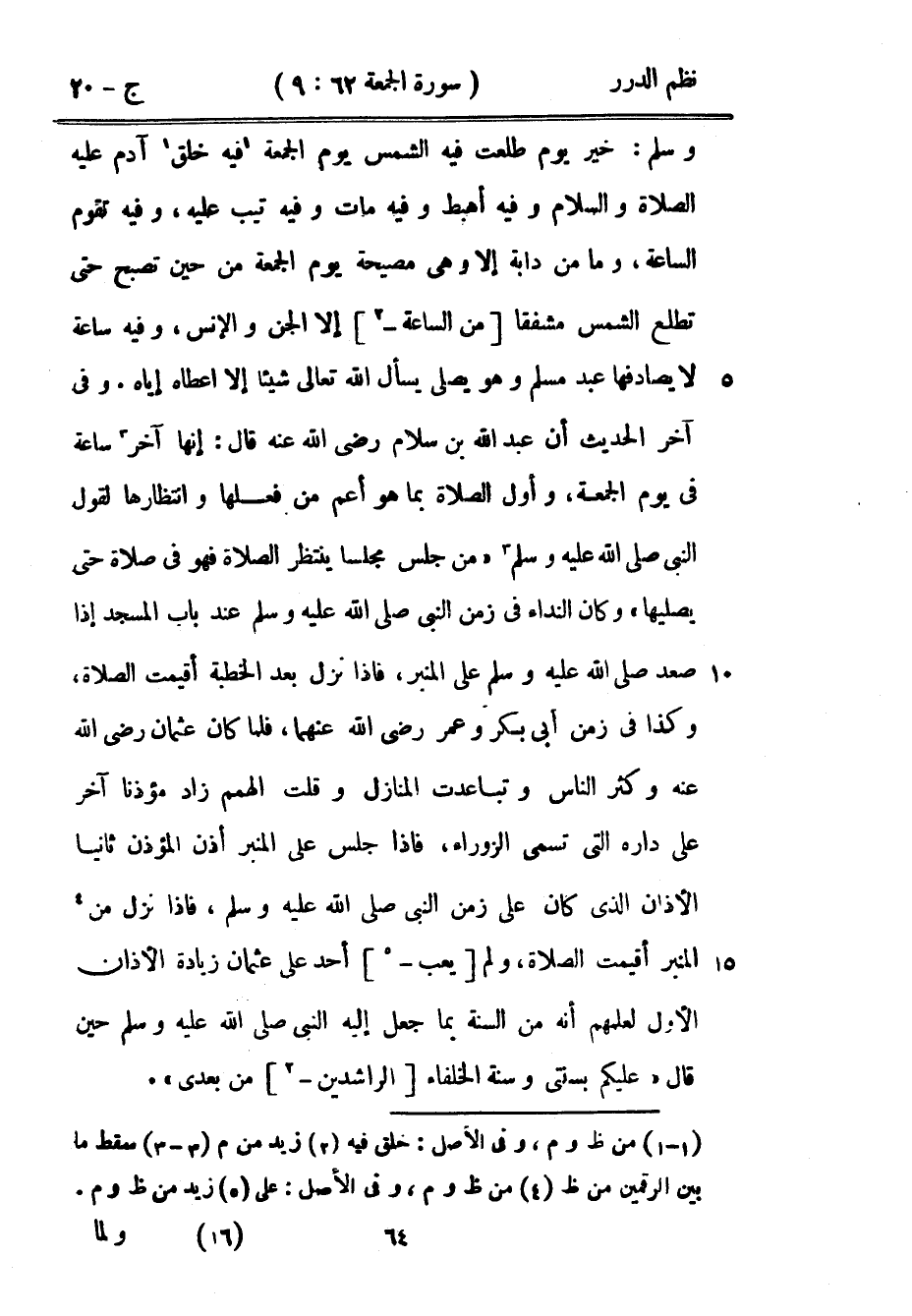 خير يوم طلعت فيه الشمس يوم الجمعة فيه خلق آدم عليه الصلاة والسلام وفيه أهبط وفيه مات وفيه تيب عليه، وفيه تقوم الساعة، وما من دابة إلا وهي مصيحة يوم الجمعة من حين تصبح حتى تطلع الشمس مشفقاً من الساعة إلا الجن والإنس، وفيه ساعة لا يصادفها عبد مسلم وهو يصلي يسأل الله تعالى شيئاً إلا أعطاه إياه» وفي آخر الحديث أن عبد الله بن سلام رضي الله عنه قال: إنها آخر ساعة يوم الجمعة، وأول الصلاة بما هو أعم من فعلها وانتظارها لقول النبي صَلَّى اللهُ عَلَيْهِ وَسَلَّمَ «من جلس مجلساً ينتظر الصلاة فهو في صلاة حتى يصليها» وكان النداء في زمن النبي صَلَّى اللهُ عَلَيْهِ وَسَلَّمَ عند باب المسجد إذا صعد صَلَّى اللهُ عَلَيْهِ وَسَلَّمَ على المنبر، فإذا نزل بعد الخطبة أقيمت الصلاة، وكذا في زمن أبي بكر وعمر رضي الله عنهما، فلما كان عثمان رضي الله عنه وكثر الناس وتباعدت المنازل وقلت الهمم زاد مؤذناً آخر على داره التي تسمى الزوراء، فإذا جلس على المنبر أذن المؤذن ثانياً الأذان الذي كان على زمن النبي صَلَّى اللهُ عَلَيْهِ وَسَلَّمَ، فإذا نزل من المنبر أقيمت الصلاة، ولم يعب أحد على عثمان زيادة الأذان الأول لعلمهم أنه من السنة بما جعل إليه النبي صَلَّى اللهُ عَلَيْهِ وَسَلَّمَ حين قال: «عليكم بسنتي وسنة الخلفاء الراشدين من بعدي» .