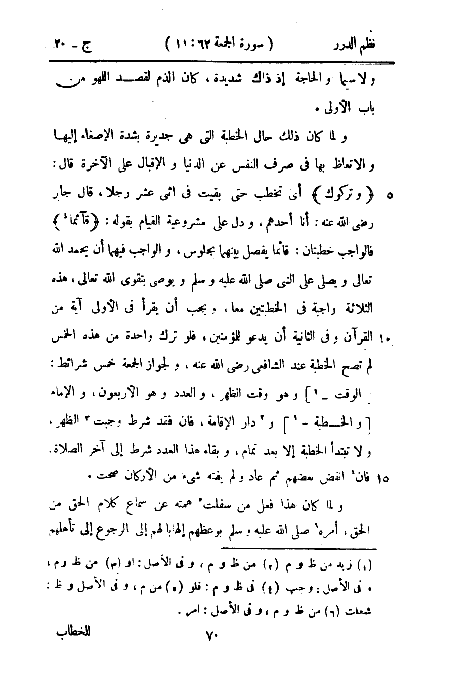 ولما كان ذلك حال الخطبة التي هي جديرة بشدة الإصغاء إليها والاتعاظ بها في صرف النفس عن الدنيا والإقبال على الآخرة قال: {وتركوك} أي تخطب حتى بقيت في اثني عشر رجلاً، قال جابر رضي الله عنه: أنا أحدهم، ودل على مشروعية القيام بقوله: {قائماً} فالواجب خطبتان: قائماً يفصل بينهما بجلوس، والواجب فيهما أن يحمد الله تعالى ويصلي على النبي صَلَّى اللهُ عَلَيْهِ وَسَلَّمَ ويوصي بتقوى الله تعالى، هذه الثلاثة واجبة في الخطبتين معاً، ويجب أن يقرأ في الأولى آية من القرآن وفي الثانية أن يدعو للمؤمنين، فلو ترك واحدة من هذه الخمس لم تصح الخطبة عند الشافعي رضي الله عنه، ولجواز الجمعة خمس شرائط: الوقت وهو وقت الظهر، والعدد وهو الأربعون، والإمام والخطبة ودار الإقامة، فإن فقد شرط وجبت الظهر، ولا تبتدأ الخطبة إلا بعد تمام، وبقاء هذا العدد شرط إلى آخر الصلاة، فإن انفض بعضهم ثم عاد ولم يفته شيء من الأركان صحت.