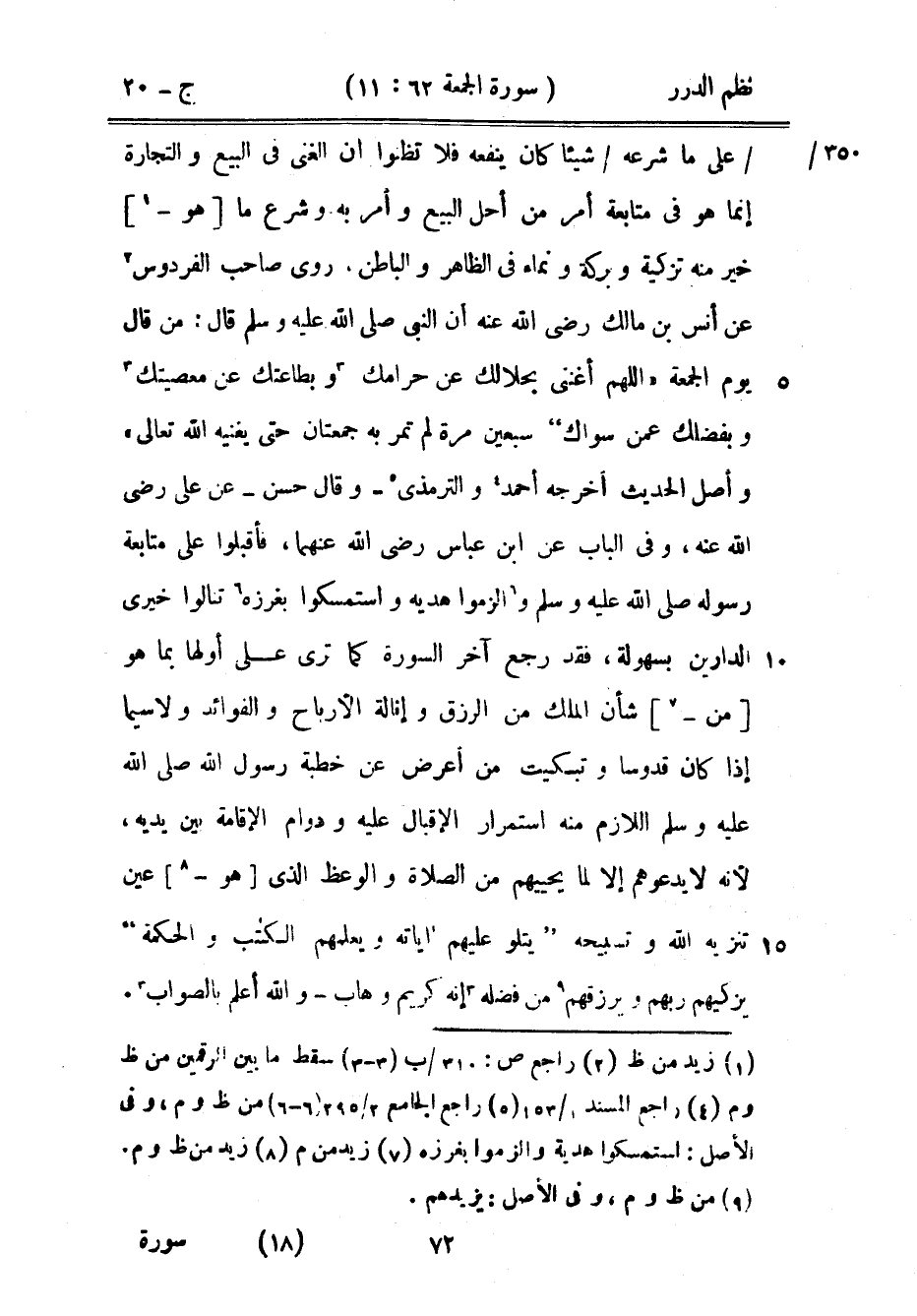 على ما شرعه شيئاً كان ينفعه فلا تظنوا أن الغنى في البيع والتجارة إنما هو في متابعة أمر من أحل البيع وأمر به وشرع ما هو خير منه تزكية وبركة ونماء في الظاهر والباطن، روى صاحب الفردوس عن أنس بن مالك رضي الله عنه أن النبي صَلَّى اللهُ عَلَيْهِ وَسَلَّمَ قال: «من قال يوم الجمعة» اللهم أغنني بحلالك عن حرامك وبطاعتك عن معصيتك وبفضلك عمن سواك سبعين مرة لم تمر به جمعتان حتى يغنيه الله تعالى «وأصل الحديث أخرجه أحمد والترمذي - وقال حسن - عن علي رضي الله عنه، وفي الباب عن ابن عباس رضي الله عنهما، فأقبلوا على متابعة رسوله صَلَّى اللهُ عَلَيْهِ وَسَلَّمَ وألزموا هدية واستمسكوا بغرزه تنالوا خيري الدارين بسهولة، فقد رجع آخر السورة كما ترى على أولها بما هو من شأن الملك من الرزق وإنالة الأرباح والفوائد ولا سيما إذا كان قدوساً وتبكيت من أعرض عن خطبة رسول الله صَلَّى اللهُ عَلَيْهِ وَسَلَّمَ اللازم منه استمرار الإقبال عليه ودوام الإقامة بين يديه، لأنه لا يدعوهم إلا لما يحييهم من الصلاة والوعظ الذي هو عين تنزيه الله وتسبيحه {يتلو عليهم آياته ويعلمهم الكتاب والحكمة} [آل عمران: 164] يزكيهم ربهم ويرزقهم من فضله إنه كريم وهاب - والله أعلم بالصواب.