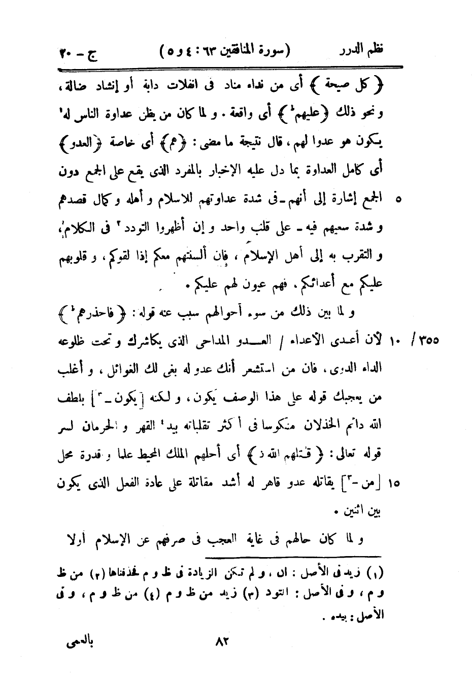 {كل صيحة} أي من نداء مناد في انفلات دابة أو إنشاد ضالة، ونحو ذلك {عليهم} أي واقعة. ولما كان من يظن عداوة الناس له يكون هو عدواً لهم، قال نتيجة ما مضى: {هم} أي خاصة {العدو} أي كامل العداوة بما دل عليه الإخبار بالمفرد الذي يقع على الجمع دون الجمع إشارة إلى أنهم - في شدة عداوتهم للاسلام وأهله وكمال قصدهم وشدة سعيهم فيه - على قلب واحد وإن أظهروا التودد في الكلام والتقرب به إلى أهل الإسلام، فإن ألسنتهم معكم إذا لقوكم، وقلوبهم عليكم مع أعدائكم، فهو عيون لهم عليكم.