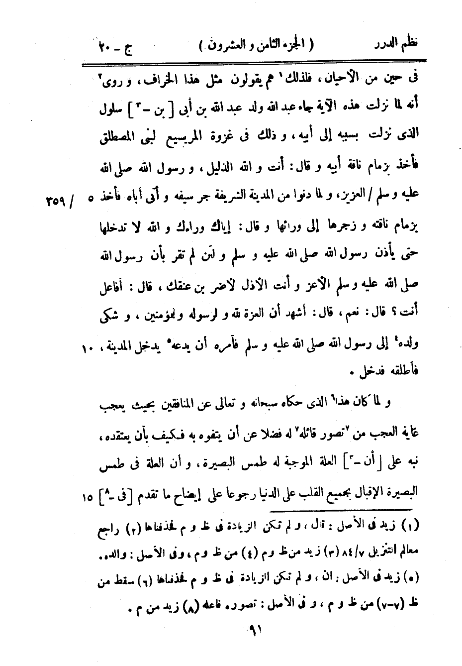 في حين من الأحيان، فلذلك هم يقولون مثل هذا الخراف، وروي أنه لما نزلت هذه الآية جاء عبد الله ولد عبد الله بن أبي ابن سلول الذي نزلت بسببه إلى أبيه، وذلك في غزوة المريسيع لبني المصطلق فأخذ بزمام ناقة أبيه وقال: أنت والله الذليل، ورسول الله صَلَّى اللهُ عَلَيْهِ وَسَلَّمَ العزيز، ولما دنوا من المدينة الشريف جر سيفه وأتى أباه فأخذ بزمام ناقته. وزجرها إلى ورائها وقال: إياك وراءك والله لا تدخلها حتى يأذن رسول الله صَلَّى اللهُ عَلَيْهِ وَسَلَّمَ ولئن لم تقر بأن رسول الله صَلَّى اللهُ عَلَيْهِ وَسَلَّمَ الأعز وأنت الأذل لأضربن عنقك، قال: أفاعل أنت؟ قال: نعم، قال: أشهد أن العزة لله ولرسوله وللمؤمنين، وشكا ولده إلى رسول الله صَلَّى اللهُ عَلَيْهِ وَسَلَّمَ فأمره أن يدعه يدخل المدينة، فأطلق فدخل.