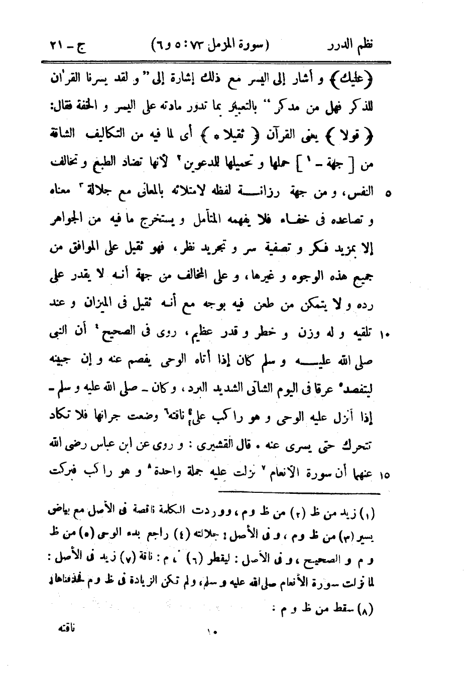{عليك} وأشار إلى اليسر مع ذلك إشارة إلى {ولقد يسرنا القرآن للذكر فهل من مدكر} [القمر: 17] بالتعبير بما تدور مادته على اليسر والخفة فقال: {قولاً} يعني القرآن {ثقيلاً *} أي لما فيه من التكاليف الشاقة من جهة حملها وتحميلها للمدعوين لأنها تضاد الطبع وتخالف النفس، ومن جهة رزانة لفظه لامتلائه بالمعاني مع جلالة معناه وتصاعده في خفاء فلا يفهمه المتأمل ويستخرج ما فيه من الجواهر إلا بمزيد فكر وتصفية سر وتجريد نظر، فهو ثقيل على الموافق من جميع هذه الوجوه وغيرها، وعلى المخالف من جهة أنه لا يقدر على رده ولا يتمكن من طعن فيه بوجه مع أنه ثقيل في الميزان وعند تلقيه وله وزن وخطر وقدر عظيم، روي في الصحيح: «إن النبي صَلَّى اللهُ عَلَيْهِ وَسَلَّمَ كان إذا أتاه الوحي يفصم عنه وإن جبينه ليتفصد عرقاً في اليوم الشاتي الشديد البرد» وكان - إذا أنزل عليه الوحي وهو راكب على ناقته وضعت جرانها فلا تكاد تتحرك حتى يسري عنه «قال القشيري: وروي عن ابن عباس رضي الله عنهما أن سورة الأنعام نزلت عليه جملة واحدة وهو راكب فبركت