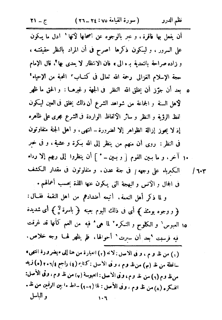 أن يفعل بها فاقرة، وعبر بالوجوه عن أصحابها لأنها أدل ما يكون على السرور، وليكون ذكرها أصرح في أن المراد بالنظر حقيقته، وزاده صراحة بالتعدية ب «إلى» فإن الانتظار لا يعدى بها، قال الإمام حجة الإسلام الغزالي رحمه الله تعالى في كتاب المحبة من الإحياء بعد أن جوّز أن يخلق الله النظر في الجهة وغيرها: والحق ما ظهر لأهل السنة والجماعة من شواهد الشرع أن ذلك يخلق في العين ليكون لفظ الرؤية والنظر وسائر الألفاظ الواردة في الشرع مجرى على ظاهره إذ لا يجوز إزالة الظواهر إلا لضرورة - انتهى، وأهل الجنة متفاوتون في النظر: روي أن منهم من ينظر إلى الله بكرة وعشية، وفي خبر آخر، وما بين القوم وبين أن ينظروا إلى ربهم إلا رداء الكبرياء على وجهه في جنة عدن، ومتفاوتون في مقدار الكشف في الجمال والأنس والبهجة التي يكون عنها اللذة بحسب أعمالهم.