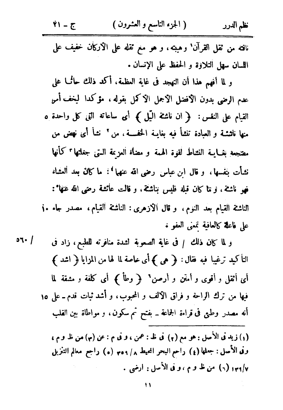 ولما أفهم هذا أن التهجد في غاية العظمة، أكد ذلك حاثاً على عدم الرضى بدون الأفضل الأجمل الأكمل بقوله: مؤكداً ليخف أمر القيام على النفس: {إن ناشئة الّيل} أي ساعاته التي كل واحدة منها ناشئة والعبادة تنشأ فيه بغاية الخفة، من نشأ أي نهض من مضجعه بغاية النشاط لقوة الهمة ومضاء العزيمة التي جعلتها كأنها نشأت بنفسها، وقال ابن عباس رضي الله عنهما: ما كان بعد العشاء فهو ناشئة، وما كان قبله فليس بناشئة، وقالت عائشة رضي الله عنها: الناشئة القيام بعد النوم، وقال الأزهري: الناشئة القيام، مصدر جاء على فاعلة كالعافية بمعنى العفو.