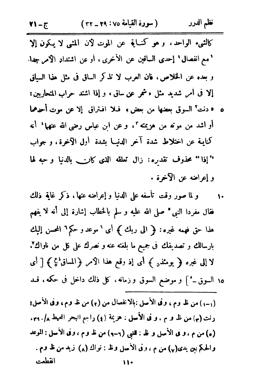كالشيء الواحد، وهو كناية عن الموت لأن المشي لا يكون إلا مع انفصال إحدى الساقين عن الأخرى، أو عن اشتداد الأمر جداً وبعده عن الخلاص، فإن العرب لا تذكر الساق في مثل هذا السياق إلا في أمر شديد مثل «شمر عن ساق» وإذا اشتد حراب المتحاربين: «دنت السوق بعضها من بعض» فلا افتراق إلى عن موت أحدهما أو أشد من موته من هزيمته، وعن ابن عباس رضي الله عنهما أنه كناية عن اختلاط شدة آخر الدنيا بشدة أول الآخرة، وجواب إذا محذوف تقديره: زال تعلقه الذي كان بالدنيا وحبه لها وإعراضه عن الآخرة.