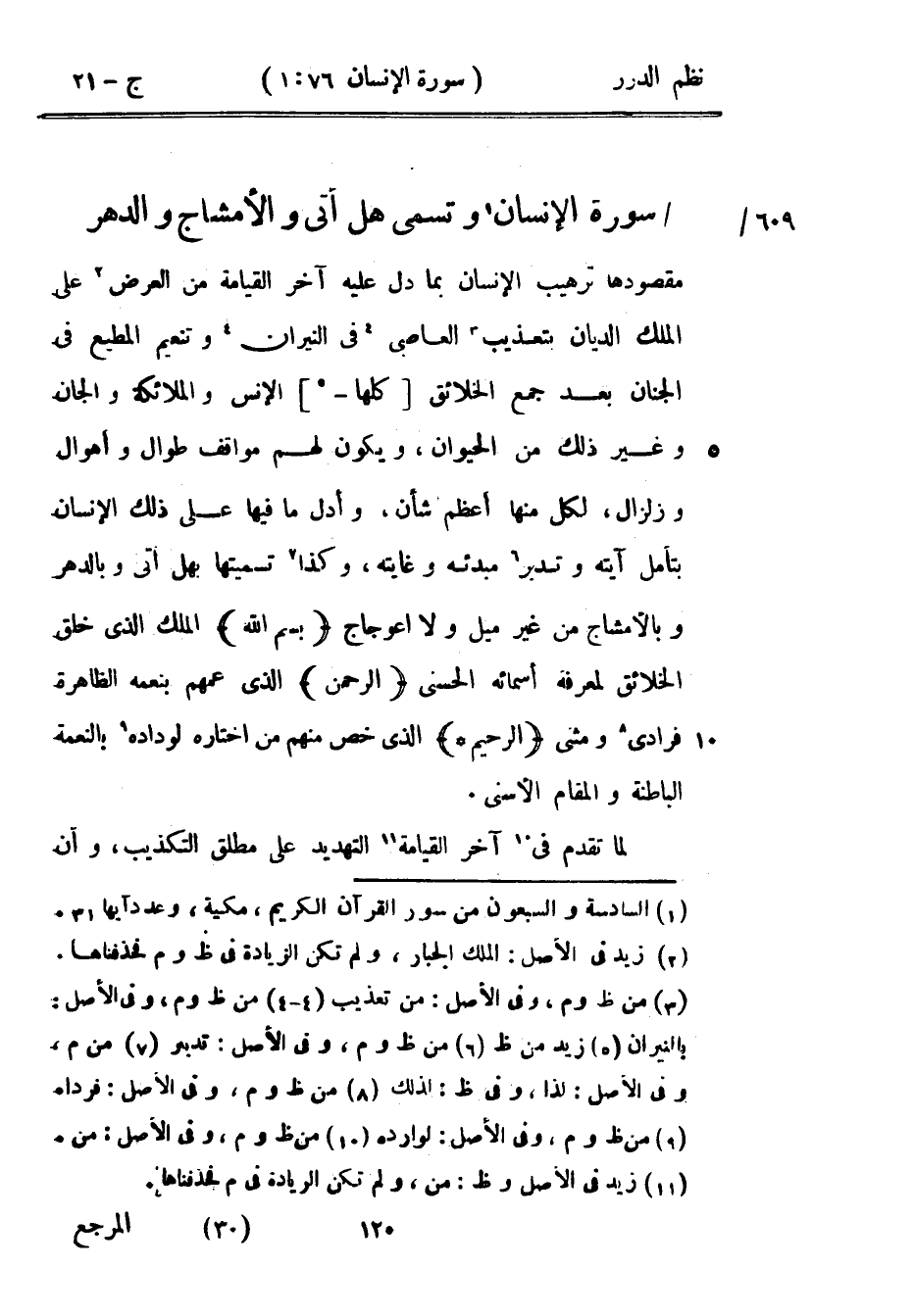 مقصودها ترهيب الإنسلنت بما دل عليه آخر القيامة من العرض على الملك الديان بتعذيب العاصي في النيران وتنعيم المطيع في الجنان بعد جمع الخلائق كلها الإنس والجان والملائكة والجان وغير ذلك من الحيوان، ويكون لهم مواقف طوال وأهوال وزلزال، لكل منها أعظم شأن، وأدل ما فيها على ذلك الإنسان بتأمل آيته وتدبر مبدئه وغايته، وكذا تسميتها بهل أتى وبالدهر وبالأمشاج من غير ميل ولا اعوجاج) بسم الله (الملك الذي خلق الخلائق لمعرفة أسمائه الحسنى) الرحمن (الذي عمهم بنعمة الظاهرة فرادى ومثنى) الرحيم (الذي خص منهم من اختاره لوداده بالنعمة الباطنة والمقام الأسنى.
