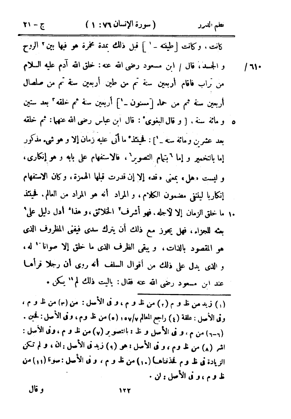 كانت، وكانت طينته - قبل ذلك بمدة مخمرة هو فيها بين الروح والجسد، قال ابن مسعود رضي الله عنه: خلق الله آدم عليه السلام من تراب فأقام أربعين سنة ثم من طين أربعين سنة ثم من صلصال أربعين سنة ثم من حمإ مسنون أربعين سنة ثم خلقه بعد ستين ومائة سنة، وقال البغوي: قال ابن عباس رضي الله عنهما: ثم خلقه بعد عشرين ومائة سنة: فحينئذ ما أتى عليه زمان إلا وهو شيء مذكور إما بالتخمير وإما بتمام التصوير، فالاستفهام على بابه وهو إنكاري، وليست «هل» بمعنى «قد» إلا إن قدرت قبلها الهمزة، وكان الاستفهام إنكارياً لينتفي مضمون الكلام، والمراد أنه هو المراد من العالم، فحينئذ ما خلق الزمان إلا لأجله، فهو أشرف الخلائق، وهذا أدل دليل على بعثه للجزاء، فهل يجوز مع ذلك أن يترك سدى فيفنى المظروف الذي هو المقصود بالذات، ويبقى الظرف الذي ما خلق إلا صواناً له، والذي يدل على ذلك من أقوال السلف أنه روي أن رجلاً قرأها عند ابن مسعود رضي الله عنه فقال: يا ليت ذلك لم يكن.